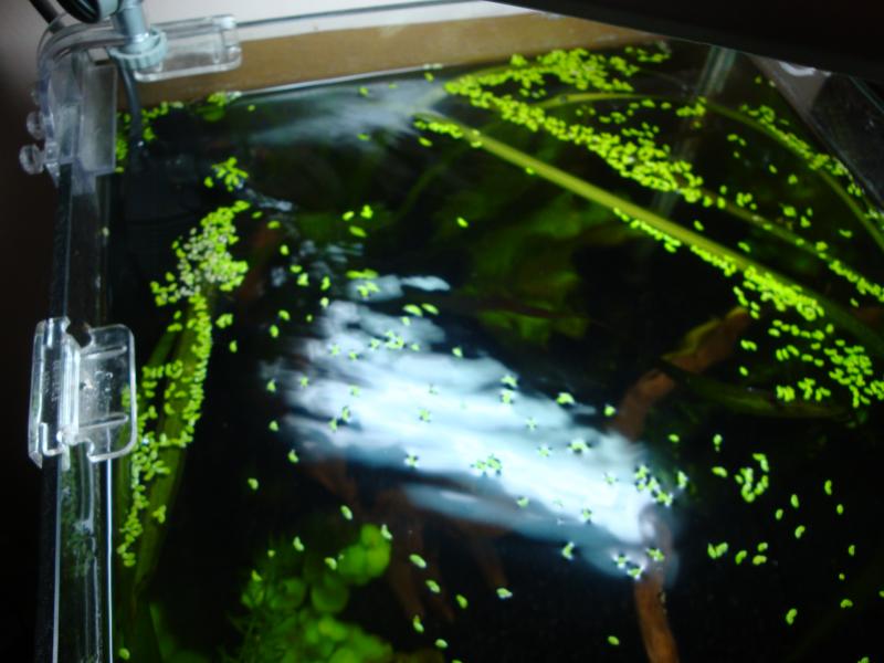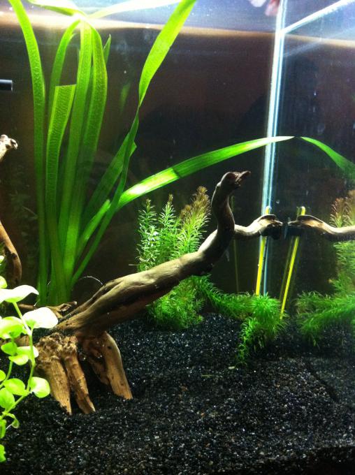 Ανεβαζω και αλλες φωτογραφιες.Εχουν φουντωσει τα φυτα εβαλα και φακη στην επιφανεια. Ανεβηκε και η θερμοκρασια στους 26 °C. Επισης τονωθηκαν και τα χρωματα του μονομαχου.(Οταν τον ειχα παρει ηταν λευκος με λιγο μπλε και κοκκινο στην ουρα.)