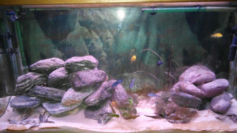 Διαστάσεις:110μ* 45π*55υ Όγκος:270λτρ μικτά Κατηγορία:lake malawi Φυτά:egeria densa, Anubias, vallisneria. Ψάρια / Άλλα είδη:7 Pseudotropheus cyaneorhabdos(maingano), 6 labidochromis caeruleus Διακοσμητικά υλικά:πέτρες , άμμο από παραλία. (χαλίκι, ξύλα κ.λ.π.) Φόντο:αφίσα Φωτισμός:2 Τ8 30w Διάρκεια φωτισμού:6 ώρες Φιλτράρισμα:1 jbl cristalprofi 250, 1 aqua nova ncf 1200 Θερμοστάτης:jager 200w Λίπανση:- Παροχή CO2:- Παράμετροι: pH: Γενική σκληρότητα (GH): 15+ Ανθρακική σκληρότητα (ΚΗ): Αμμωνία (ΝΗ3):0 Νιτρώδη (ΝΟ2):0 Νιτρικά (ΝΟ3):12.5 tetra υγρά τεστ Αλλαγές νερού:40-50λτρ κάθε 10 μέρες Θερμοκρασία:26 Άλλες πληροφορίες: Φωτογραφία: Μετά από πολλές δυσκολίες επιτέλους παρουσιάζω το νέο μου ενυδρείο. τρέχει περίπου 1 μήνα ακούω γνώμες. |