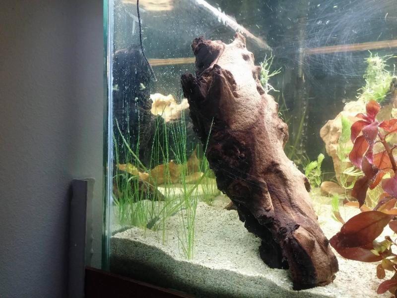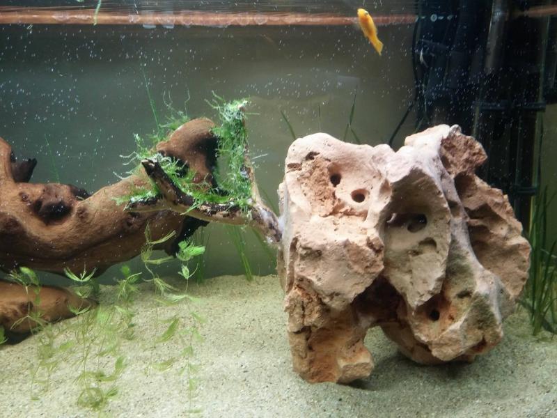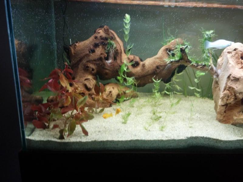 καλησπερα σας...μετα απο πολυ καιρο παρουσιαζω το ενυδρειο μου...ειναι 130 λιτρα...με εξωτερικο φιλτρο... με δυο λαμπες τ8...αμμο απο παραλια...ξυλο μοπανι και πετρα αγορασμενη..απο φυτα εχει μια βαλισνερια..κερατοφυλο ενα αλλο με πολυ λεπτο φυλο..java moss...και ludwigia rebens...το ενυδρειο τρεχει περιπου δυο μηνες...θα προσθεσω και ενυδρειακο αλατι... εχει μεσα προς το παρον 4 μολυ..και θα μπουν αλλα 4 πλατυ..ο μονος αινδιασμος μου ειναι η πετρα που πιανει πολυ χωρο στο ενυδρειο..και σκεφτομουν να τη βγαλω και να βαλω πετρες με υψωμα προς τα πισω..και να μπει μια πρασιναδα πανω στις πετρες...θα μου αρεσε και περισσοτερο πρασσινο...αλλα με ευκολα φυτα...οι μετρησεις μου ειναι...: no3 περιπου 10 no2 0 σκληροτητα περιπου 23 ph 7.2..