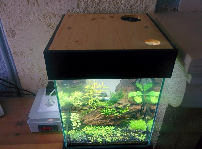 Διαστάσεις: 30x30x35 Λίτρα: ~30 Χρόνος λειτουργίας: από 2/2017 Τύπος και διάρκεια φωτισμού: 2 προβολάκια led 10w στους 4000Κ, 1050 lum το κάθε ένα. Διάρκεια 7 ώρες. Co2 και τρόπος διάχυσης: - Λίπανση: seachem flourish και seachem potassium Υπόστρωμα: μαύρο χαλίκι quartz 1-3mm Φίλτρανση: εσωτερικό φίλτρο 250 l/h με σφουγγάρι και ελαφρόπετρα Θερμοκρασία: ~22,5 C, σύστημα με ανεμιστηράκι 92mm και θερμαντήρας 25w ελεγχόμενα από stc-1000 ΝΗ3: 0 ΝΟ2: 0 ΝΟ3: >5 Λίστα φυτών: microsorum pteropus mini, limnophila aquatica, hygrophila polysperma “rosanervig", hotonia palustris, didiplis diandra, fontinalis antipyretica, fissidens fontanus, anubias, pogostemon helferi, cryptocoryne brown, lobelia cardinalis mini, monte carlo, staurogyne repens, riccia fluitans και monosolenium tenerum Λίστα ψαριών και ασπόνδυλων: carbon rili shrimp (neocaridina heteropoda) και melanoides tuberculata Συνημμένο Αρχείο 85265Συνημμένο Αρχείο 85266Συνημμένο Αρχείο 85267Συνημμένο Αρχείο 85268 Συνημμένο Αρχείο 85269Συνημμένο Αρχείο 85270Συνημμένο Αρχείο 85271Συνημμένο Αρχείο 85272 Είχα καιρό να φτιάξω κάτι και κόλλησα ένα κυβάκι... Το ενυδρείο στήθηκε για να δοκιμάσω κάτι διαφορετικό και να φιλοξενήσει γαρίδες σε νερό βρύσης. Αφού έτρεξε για περίπου ένα μήνα και το πάλεψα κάπως με τα φυτά, μπήκαν carbon rili οι οποίες δείχνουν να τα πηγαίνουν καλά. Τα φυτά από την άλλη όχι και τόσο, ειδικότερα το monte carlo δε βλέπω να τραβάει αφού έχει αρχίσει να σαπίζει σε κάποια σημεία. Υπάρχει και η κλασσική καφέ άλγη αλλά μετά την είσοδο των σαλιγκαριών και ένα καθάρισμα που έγινε έχει αρχίσει να μειώνεται. Δεκτές όλες οι παρατηρήσεις και προτάσεις για βελτίωση :). |