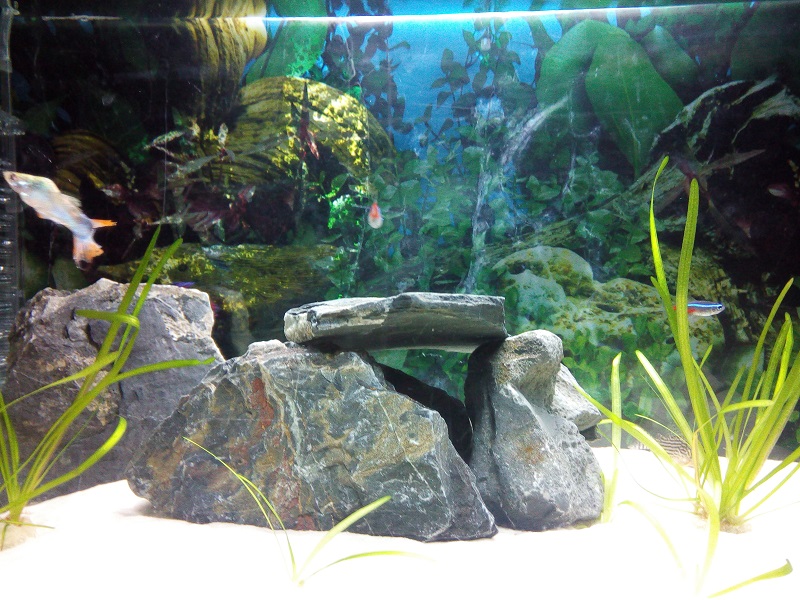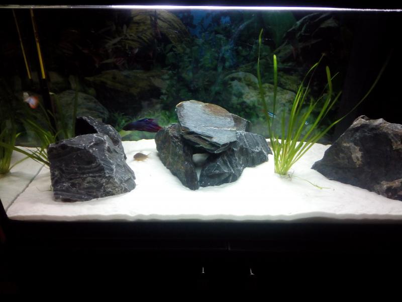 60 Λίτρα με καπάκι Ψάρια: 2 Coridoras, 2 Neon 1 Μονομάχο (μερικά λάθρο σαλιγκάρια που δε ξέρω) Φυτά: Vallisneria,Rotala,λευκοκέφαλα, Hygrophylla corymbosa,Java moss Κατηγορία: Κοινωνικό φυτεμένο Διακοσμητικά υλικά :- Φόντο: Σκούρο πόστερ με φυτά Πέτρες: - Ξύλα: 2 mopani Άλλα διακοσμητικά : - Υπόστρωμα: -Όχι Βυθός: χαλαζιακή άμμο Φωτισμός Πηγές φωτισμού (πλήθος και τύπος):1 Λάμπα ~15 watt T8 Gro-Lux Fluorescent Διάρκεια φωτισμού: 6 ώρες (16:00-22:00) Υποστήριξη οργανισμών Φίλτρανση: Aquatek (χωρίς άνθρακα ) Θέρμανση/ Ψύξη: κοινός θερμοστάτης/USB 8cm fan Λίπανση: - Ταμπλέτες για τα φυτά/Sera Fe Παροχή CO2: -D.I.Y. 1/sec Διατροφή:Flakes Παράμετροι pH:8 Γενική σκληρότητα (GH):8 Ανθρακική σκληρότητα (ΚΗ):4-6 Αμμωνία (ΝΗ3): 0 Νιτρώδη (ΝΟ2): 0 Νιτρικά (ΝΟ3): 0 Φωσφορικά (PΟ4): - Μέση Θερμοκρασία (°C): 28 Συντήρηση Αλλαγές νερού: ~20lt ανά βδομάδα Προετοιμασία νερού/πρόσθετα: Sera aquatan Πλέον πολλές αλλαγές μετά την πρώτη παρουσίαση, πολλά τα λαθη, πολλές οι διορθώσεις. Κάποια από τα λάθη ακόμα παραμένουν. Στο μέλλον θα προστεθούν μερικές γαριδούλες και κάποια ακόμα εύκολα φυτά. |