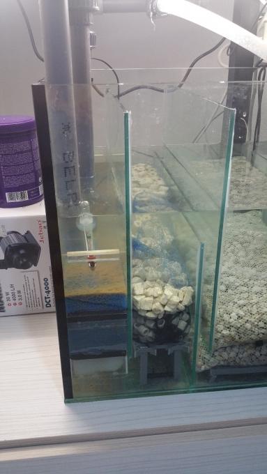 Με την ευκαιρία της αλλαγής νερού σήμερα έγιναν και οι παρακάτω αλλαγές. Κόπηκε το αλφαδολάστιχο και πλέον δεν κάνει τόση βόλτα το νερό μετά την αντλία επιστροφής. Επίσης σηκώθηκε αρκετά πιο πάνω το βιολογικό υλικό στο πρώτο διαμέρισμα μετά τα σφουγγάρια όπως φαίνεται και στην παρακάτω φώτο. Η ελαφρόπετρα θα σηκωθεί με την ευκαιρία μιας επόμενης αλλαγής νερού.