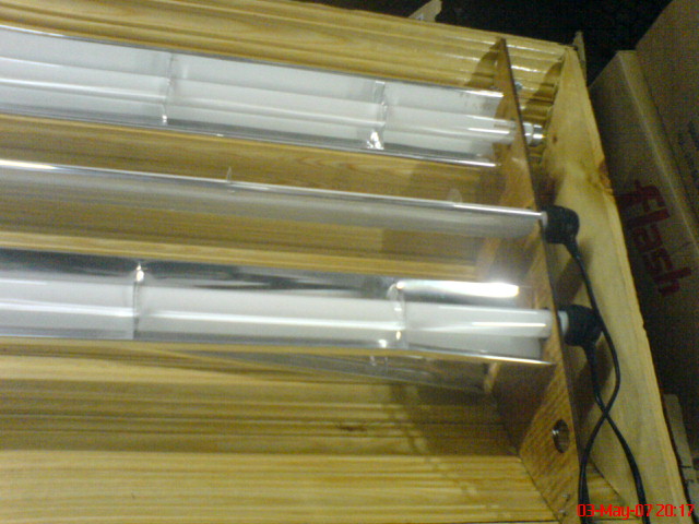 το ενυδρειο προοριζεται για φυτεμενο με δισκους, ετσι για φωτισμο επιλεχθηκαν 4 λαμπες τ8 90mm.1 arcadia fres 30w, 1 aqua glo 30w, και 2 gro lux 30w sylvania.με στεγανα ακροφυσια acadia και ηλ.μπαλαστ για τ8.