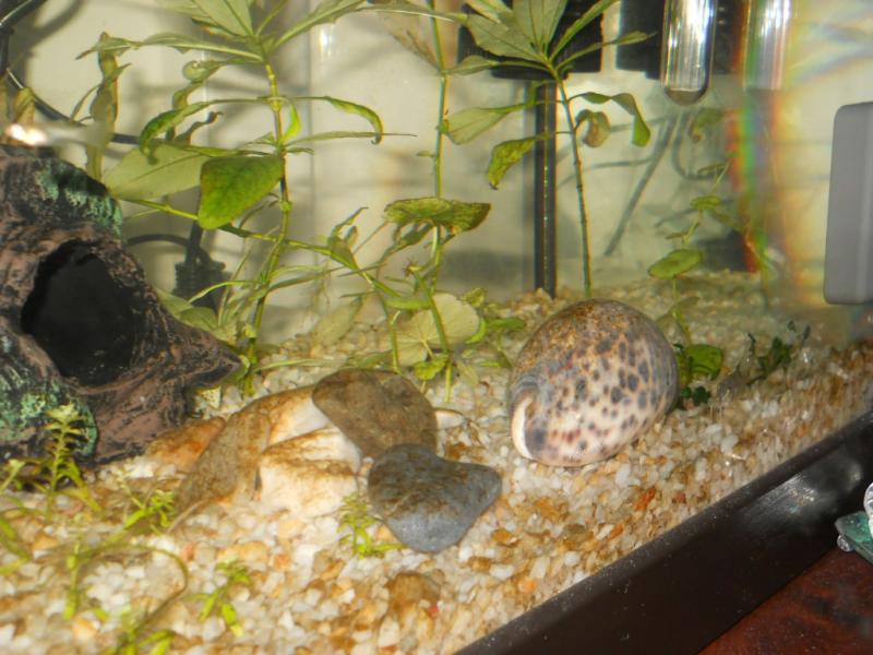 Εδώ και αρκετές μέρες έχει κάνει δειλά-δειλά την παρουσία της καφέ άλγη, κυρίως στο χαλίκι και πίσω τζάμι, εκεί μου είναι αυξημένη η ροή του νερού από το φίλτρο, η οποία καθαρίζεται με τον μαγνήτη. Μετά από την 5ήμερη απουσία μου από το σπίτι, παρουσιάστηκε καφέ άλγη και στα κοχύλια και στα φύλλα των φυτών.