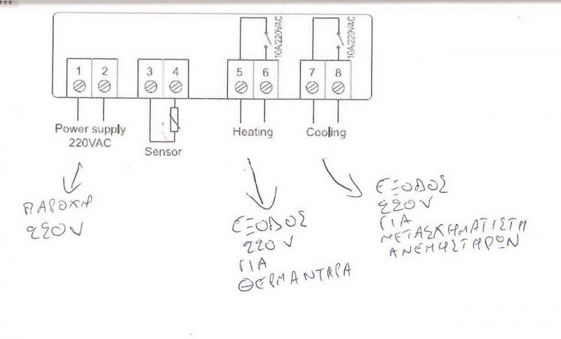 παρέλαβα σήμερα ένα controller θερμοκρασίας stc 1000 και ενώ τον σύνδεσα δεν δουλεύει σωστά. τον σύνδεσα όπως λέει το παρακάτω διάγραμμα, δηλαδή στο 1 & 2 την παροχή του ρεύματος, στην 3 & 4 τον σενσορα θερμοκρασίας, στο 5 & 6 ένα καλώδιο με φις θηλυκό που πηγαίνει στον θερμαντήρα και στο 7 & 8 άλλο ένα καλώδιο με θηλυκό φις που πηγαίνει στον μετασχηματιστή με τα ανεμιστηράκια. το σέταρα και ενώ αυτό δείχνει ότι ανάβει ή το cool ή το heat, ανάλογα την θερμοκρασία αυτό δεν φέρνει ρεύμα έχω κάνει κάτι λάθος ???? βοηθήστε σας παρακαλώ.
