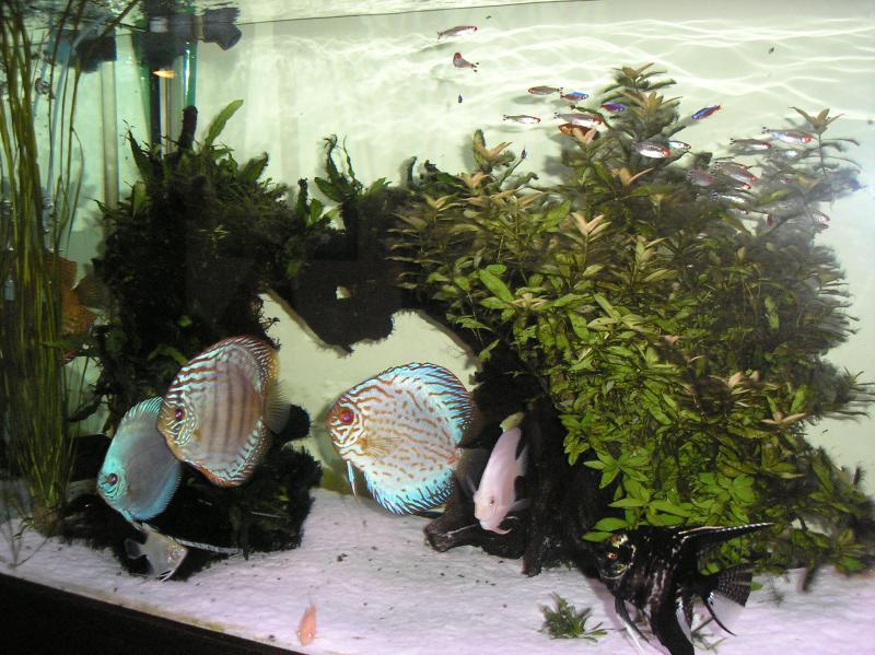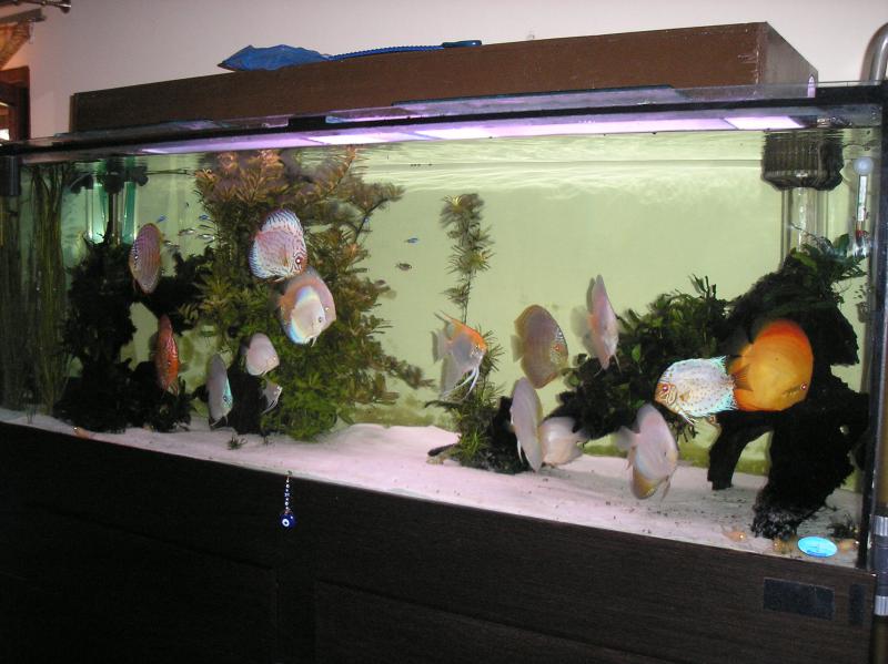 καλησπερα σε ολους. μια που αυτον τον καιρο κανω τη ζωη μου!!! (ανεργος) ειπα να σας δειξω το καινουργιο μου παιχνιδι. τα ονειρα τελικα καμμια φορα γινονται πραγματικοτητα. αφου περασα απο διαφορα μεγεθη ενυδρειων βρεθηκα με ενα τερας στο σπιτι μου και σας το παρουσιαζω. διαστασεις 1.80-60-60 sump 1.50-50-50 το οποιο εχει μεσα καμμια 50αρια λιτρα siporax-substratpro και 40 λιτρα ελαφροπετρα, εχω χαλαζιακη αμμο 60κιλα απο τον ερμη (6 ευρω το 10κιλο) απο φυτα εχω διαφορα, ανουμπιες, βαλισνεριες, υγροφιλα και κατι αλλα, φωτισμο εχω 3-36w sylvania grolux, 2-54w philips warm white. αλλαγες νερου κανω καθε τεσσερις μερες το 70% περιπου περασμενο απο προφιλτρα. ph 7.5, gh 10, kh 6. παρτε μερικες φωτο και μετα χωστε τα κανονικα!!!