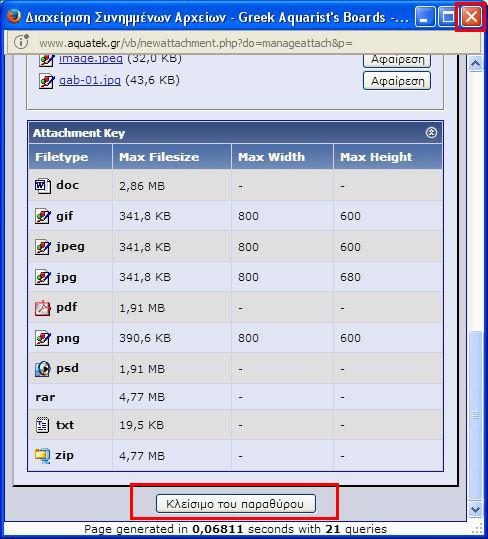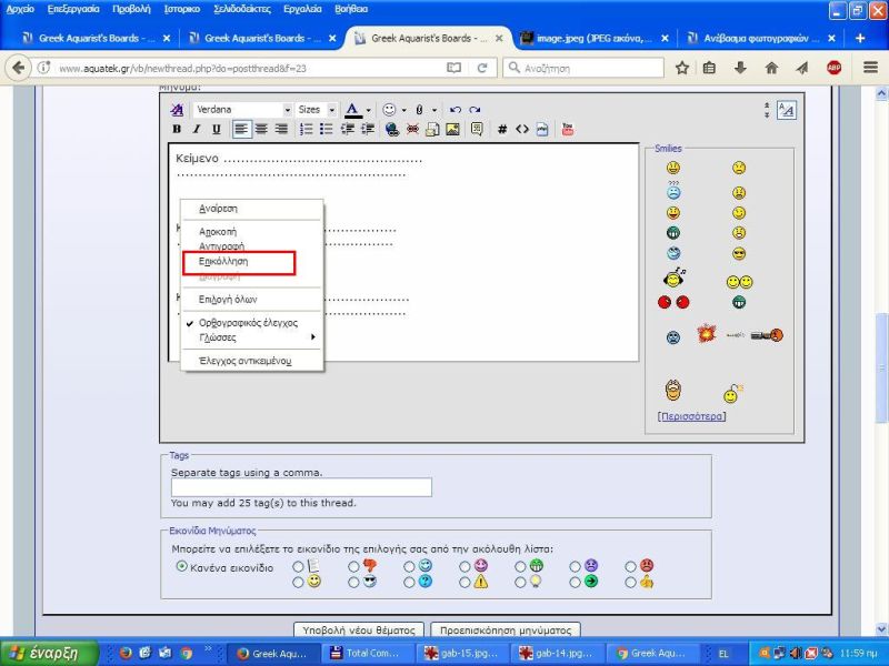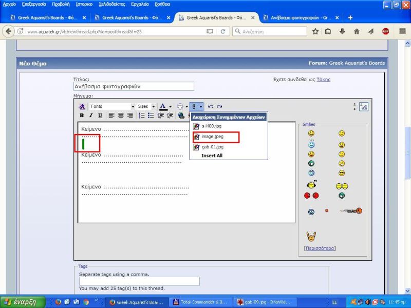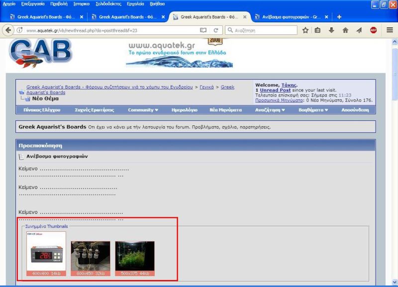 και θέλουμε να προσθέσουμε φωτογραφίες υπάρχει χαμηλά ένα κουμπί που γράφει "Διαχείριση Συνημμένων Αρχείων" Επιλέγοντας τη "Διαχείριση Συνημμένων Αρχείων" θα εμφανισθεί αυτό το παράθυρο Πατώντας το κουμπί "Αναζήτηση" θα μας εμφανισθεί ένα παράθυρο για να επιλέξουμε φωτογραφία απο τον σκληρό μας δίσκο Εάν θέλουμε και αλλη ή άλλες φωτογραφίες επιλέγουμε την επόμενη "Αναζήτηση" Επιλέγουμε τη κάθε "Αναζήτηση" ξεχωριστά για κάθε φωτογραφία που θέλουμε να μεταφορτώσουμε από τον σκληρό μας δίσκο, και μπορούμε σε αυτό παράθυρο να μεταφορτώσουμε μέχρι 10 φωτογραφίες, αφού επιλέξουμε μέχρι 10 φωτογραφίες , επιλέγουμε το "Ανέβασμα" Με αυτήν την επιλογή οι φωτογραφίες θα ανέβουν στο φόρουμ, αν χρειαστεί να μεταφορτώσουμε και άλλες φωτογραφίες , θα επαναλάβουμε την ίδια διαδικασία Σε αυτό το παράθυρο μπορούμε να ανεβάσουμε και φωτογραφίες που δεν υπάρχουν στον σκληρό μας δίσκο αλλά σε μία ιστοσελίδα. Πάμε στην ιστοσελίδα που θέλουμε και αντιγράφουμε τη διεύθυνση της και βάζουμε τη διεύθυνση (url) της φωτογραφίας στο αντίστοιχο πεδίο και επιλέγοντας το αντίστοιχο "Ανέβασμα" οι φωτογραφίες θα μεταφωρτοθούν στο φόρουμ μετά το ανέβασμα, σε αυτό το παράθυρο μπορούμε να δούμε τις φωτογραφίες αλλά μπορούμε και να αφαιρέσουμε όσες δεν θέλουμε Τελειώνοντας το ανέβασμα και γενικά τη διαχείριση κλείνουμε αυτό το παράθυρο. Το θέμα μας πλέον θα έχει αυτή την μορφή και κάνοντας προεπισκόπηση θα έχει αυτή την μορφή και οι φωτογραφίες θα είναι με μορφή εικονιδίων στο κάτω μέρος του θέματος Αν θέλουμε να βάλουμε τα εικονίδια ανάμεσα στο κείμενο τότε θα πρέπει να επιλέξουμε "Συνημμένα αρχεία" που είναι ο "συνδετήρας" έχουμε αφήσει τον δρομέα στο σημείο που θέλουμε να μπει το εικονίδιο και πατώντας τον "Συνδετήρα" θα μας εμφανίσει τα ονόματα των φωτογραφιών ή άλλων συνημμένων που έχουμε ήδη ανεβάσει με τη προηγούμενη διαδικασία (με τη πράσινη κάθετη γραμμή σας δείχνω που άφησα τον δρομέα) και στο σημείο που είχαμε τον δρομέα θα εμφανιστεί ο κωδικός του συνημμένου και κάνοντας προεπισκόπηση θα δούμε το θέμα μας να έχει πάρει αυτή τη μορφή Αν θέλουμε να φέρουμε μέσα στο κείμενο τη πλήρη εικόνα και όχι το εικονίδιο θα κάνουμε τα παρακάτω. Θα τοποθετήσουμε τον δρομέα (ποντίκι) επάνω στο συνημμένο που βλέπουμε στο κάτω μέρος της οθόνης στη "Διαχείριση συνημμένων" και με δεξί κλικ θα επιλέξουμε "¶νοιγμα δεσμού σε νέα καρτέλα" τότε θα εμφανιστεί πλήρης η φωτογραφία σε νέα καρτέλα, τοποθετούμε τον δρομέα σε οποιοδήποτε σημείο της φωτογραφίας και επιλέγουμε "Αντιγραφή εικόνας" ερχόμαστε στο κείμενο μας , και τοποθετούμε τον δρομέα στο σημείο που θέλουμε την εικόνα και πατώντας δεξί κλικ επιλέγουμε "Επικόλληση" τότε η εικόνα θα μεταφερθεί μέσα στο κείμενο μας και με προεπισκόπηση θα δούμε αυτή τη μορφή Για το ίδιο αποτέλεσμα μπορούμε και με άλλο τρόπο Αντί να κάνουμε "Αντιγραφή εικόνας" αντιγράφουμε την διεύθυνση της φωτογραφίας ή μπορούμε επάνω στα συνημμένα να πατήσουμε δεξί κλικ και να επιλέξουμε "Αντιγραφή τοποθεσίας δεσμού" Μετά επιλέγουμε την εισαγωγή εικόνας Θα εμφανιστεί παράθυρο που θα μας ζητάει τη διεύθυνση της εικόνας Εχω παρατηρήσει πως ο 2ος τρόπος είναι απαραίτητος όταν χρησιμοποιώ chrome, γιατί με τον chrome δεν λειτουργεί η επικόλληση εικόνας και σε αυτή τη περίπτωση θα προστεθεί μέσα στο θέμα ο σύνδεσμος της εικόνας Με προεπισκόπηση θα δούμε πως έχουμε το