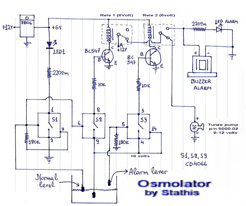 OSMOLATOR by Stathis Πρόκειται για ένα κύκλωμα αυτόματης αναπλήρωσης νερού. Σκοπός του είναι να κρατήσει σταθερή την στάθμη του νερού στο ενυδρείο. Επίσης μπορούμε να έχουμε ηχητική και οπτική ένδειξη στην περίπτωση που η στάθμη του νερού περάσει από το επιθυμητό όριο. Δεν χρησιμοποιούνται πουθενά μηχανικά φλοτέρ που μπορεί να ‘κολλήσουν’ από άλατα. Τα δύο αισθητήρια είναι απλές ανοξείδωτες βίδες στηριζόμενες σε πλαστικές βάσεις. Το ένα άκρο έχει 6 volt , το δεύτερο ορίζει την επιθυμητή στάθμη νερού και το τρίτο το επίπεδο συναγερμού. Η τροφοδοσία του κυκλώματος μπορεί να γίνει από ένα απλό τροφοδοτικό 12v/1,5amp. Σε κανένα σημείο της κατασκευής δεν υπάρχουν επικίνδυνες τάσεις - εντάσεις για εμάς και τα ψάρια μας.. Η καρδιά του κυκλώματος είναι το ολοκληρωμένο CD4066 που αποτελείται από 4 ελεγχόμενους διακόπτες. Ας δούμε λοιπόν την λειτουργία του κυκλώματος. Oι τρείς διακόπτες S1,S2,S3 ελέγχουν τα Led1,Rele1, Rele2, αντίστοιχα. Στην περίπτωση που η στάθμη του νερού πέσει από το επιθυμητό όριο το rele 1 και το rele 2 είναι σε κατάσταση ηρεμίας (όπως είναι οι διακόπτες στο σχήμα). Τότε δίνεται ρεύμα στην αντλία και αρχίζει η αναπλήρωση. Όταν η στάθμη του νερού φτάσει το επιθυμητό όριο τότε κλείνουν οι διακόπτες S1, S2 και Rele 1 ,ανάβει το Led1 και έχουμε διακοπή της τροφοδοσίας της αντλίας. Στην περίπτωση που για οποιονδήποτε λόγο το νερό περάσει το επιθυμητό όριο και φτάσει το Alarm level τότε κλείνουν τα S3 , Rele 2 , και έχουμε αποσύνδεση της αντλίας , άναμμα του led 2 καθώς και ενεργοποίηση του Buzzer (ηχητικό alarm). Tips Στο σημείο Α του Rele 1 μπορούμε να βάλουμε ένα σταθεροποιητή 7808 με 2,2 K στη γη και να έχουμε ρυθμιζόμενη τάση 8-12v στην αντλία. Έτσι μπορούμε να ελέγξουμε την ροή της αντλίας και δεν την ζορίζουμε. Αντί για την Tunze 5000.02 μπορούμε να χρησιμοποιήσουμε ένα εξίσου καλό αντλιάκι 12 volt από Αθηνάς Υλικά CD4066 , 2X BC547 , 2X Rele 6 volt , 2 x led’s , Buzzer 12v , 7806 , 2x 180k , 2x10k , 2x220ohm , 4 ανοξείδωτες βίδες , μία αντλία 12v , πλαστικό κουτί , βύσματα . Kόστος Περίπου 40-50 ευρώ. |