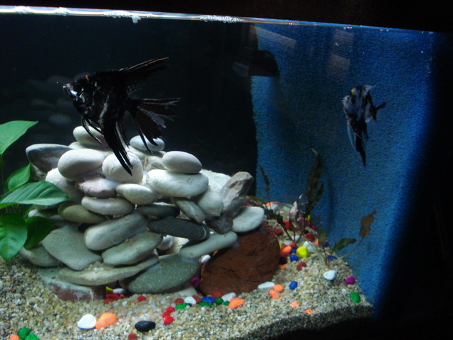 Διαστάσεις: 120Χ40Χ35 Όγκος: Περιπου 150 λιτρα καθαρα Κατηγορία: κοινωνικο Φυτά: 1 anubia 1 cryptocorryne 1 vallisneria Ψάρια / ¶λλα είδη: 1 Balandiocheilus melanopterus (ειναι μικρό 5-6 cm) 3 glass fish 5 clown (5 cm) 2 molly 2 μονομαχινες 2 αangelfish 2 gibbiceps ( 4-5 cm ) Διακοσμητικά υλικά: πετρα λάβας και πετρες απο αχελλωο ποταμο (μη-ασβεστολιθικες) κολλημενες με ενυδρειακη σιλικονη και καρυδες κομμενες στη μεση(τις εχω ξυσει και τις εχω βρασει) Φόντο: Μαυρο χαρτονι Φωτισμός: Sera 1Χ25 Watt Διάρκεια φωτισμού: 8-10 ωρες Φιλτράρισμα: 1 φιλτρο τυπου αμβουργου με κυκλοφορητη 2000 λιτρα/ωρα Θερμοστάτης: 1 της Jager (γραφει max 300l, δεν ξερω τα watt) Λίπανση:οχι Παροχή CO2:οχι Παράμετροι: pH: 6,5 Γενική σκληρότητα (GH): Ανθρακική σκληρότητα (ΚΗ): Αμμωνία (ΝΗ3): 0 Νιτρώδη (ΝΟ2): 0 Νιτρικά (ΝΟ3): περιπου 15 Αλλαγές νερού: καθε εβδομαδα 40% Θερμοκρασία: 26 C ¶λλες πληροφορίες: Φωτογραφία: Πως σας φαινεται ρε παιδια? Καθε βοηθεια ευπροσδεκτη! Μπορω αραγε να βαλω μεσα Guppies???