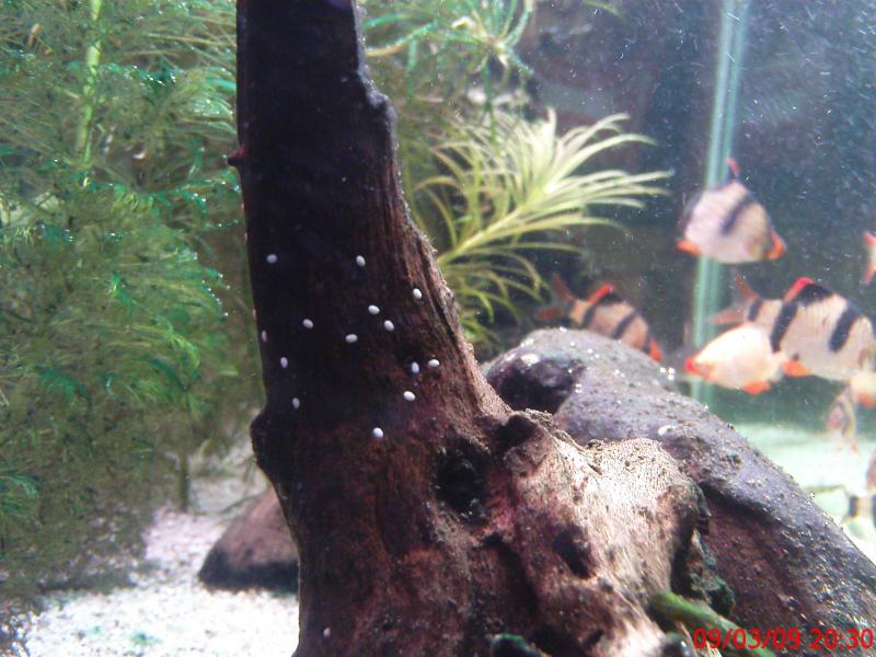 Tα αυγα στο καπακι ειναι σιγουρα απο τα apple αλλα τα αλλα τα ασπρα στο ξυλο δεν ξερω..τα zebra nerite κανουν αυγα αλλα οι νυμφες τους θελουν υφαλμυρο/θαλασσινο νερο για να μεγαλωσουν, χωρια που πρεπει να ειναι και τα 2 φυλα μαζι για να γεννησουν.