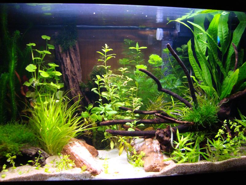 Εγώ θα έλεγα καθόλου φυτά και γαρίδες μόνο ξύλα, ξερά φύλλα στον πάτο blackwater και ένα ζευγάρι ramirezi... Έχω την εντύπωση ότι τα λίτρα φτάνουν... ή κάνω λάθος?