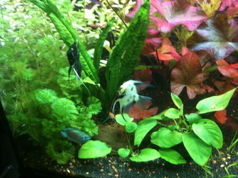 Πληροφορίες Διαστάσεις:100*40*50 (aqua pro 180) Όγκος:180 Κατηγορία:κοινωνικό Φυτά: Anubias barteri var. nana ,Hygrophila corymbosa,Rotala macrandra,egeria densa,ceratophyllum ,cryptocorines ,nymphaea lotus. Ψάρια / ¶λλα είδη: 4 apple snails , 5 corydoras , 2 angelfish , 2 goyramis. Διακοσμητικά υλικά:Υπόστρωμα flourite , χαλαζιακό χαλίκι μαύρο 5 εκ. 3 ρίζες Φόντο: Μαύρο χαρτόνι Φωτισμός: 1 plant power 30watt και 1 λευκή 30watt Διάρκεια φωτισμού:10 ώρες Φιλτράρισμα:eheim aquaball 2212 (650t/h) , eheim ecco pro 2236 (750lt/h) Θερμοστάτης: JAGER 150 Watt Λίπανση: 15 ml aquaflorin, 2 ml σίδηρο aquaflorin Παροχή CO2:diy co2 Παράμετροι: pH:7.3 Γενική σκληρότητα (GH):13 Ανθρακική σκληρότητα (ΚΗ):15 Αμμωνία (ΝΗ3):0 Νιτρώδη (ΝΟ2):0 Νιτρικά (ΝΟ3):10 Αλλαγές νερού:1 την εβδομάδα 30 % Θερμοκρασία:26c ¶λλες πληροφορίες: Είναι το πρώτο μου ενυδρείο που στήνω, πείτε μου αν σας αρέσει και οποιαδήποτε αλλαγή δεκτή. Τρέχει περίπου 1 μήνα με τα φυτά και έχουν πάρει τα πάνω τους . θέλω να βάλω φυτό τυπου γκαζόν στην μέση του ενυδρείου σκεφτόμουν αυτό Marsilea hirsuta , υπάρχει κάποιο αλλο ευκολο οπως αυτό? Τα aplle snails γενήσανε , αν βγουν όλα αυτά λέτε να έχω προβλημα με τα φυτά? |