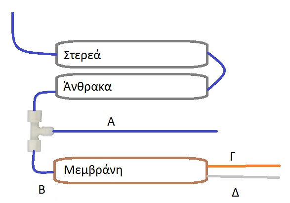 το βανακι παει στο Α. πριν την μεμβρανη. ------------------------- Οποτε διορθωνω το ποστ Το βανακι παει στο Α Το νερο θα πηγαινει και στο Α και στο Β, αλλα οτσν ειναι ανοιχτο το βανακι, θα βγαινει μονο απο το Α αφου θα βρισκει αντισταση στο flow resrtictor (Γ) και στη μεμβρανη. Θα γεμιζει ομως παντα το φυσσιγιο της μεμβρανης και δεν θα στεγνωσει. Οταν κλεινεις το βανακι στο Α, το νερο θα κατευθυνεται αναγκαστικα στο Β οπου θα βγαινει απο τις εξοδους της μεμβρανης. Μπορεις να βαλεις ταπες αν θες στα σωλήνακια των εξοδων της μεμβρανης για να μη σταζει ή αδειασει λογω κλισης ή εξατμισης και στεγνωσει.