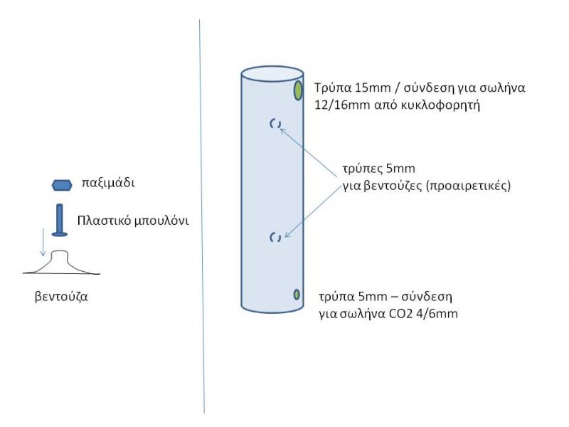 http://www.youtube.com/watch?v=hM6DLRuEzHk&hd=1 αλλά η τιμή του ήταν απαγορευτική για μένα. Υπάρχουν αντίστοιχες κατασκευές στο youtube και αλλού με μπουκάλια πλαστικά, μπιμπερό (α-λα Tsamis) κ.α., αλλά ήθελα κι εγώ να κάνω κάτι γυάλινο. Οπότε, εχουμε και λέμε: Υλικά: 1. Ογκομετρικός σωλήνας 250ml (για το ενυδρείο μου που είναι 160λτ. περίπου, πρέπει να είναι ΟΚ..). Σαν αυτόν http://www.instrand.gr/ViewShopProdu...oductId=282010 (mods: ας βγει το λινκ αν θεωρείται διαφήμιση) Προσοχή, να είναι από απλό γυαλί, όχι πυρίμαχο, tempered, ή ότιδήποτε άλλο. 2. ποτηροτρύπανα για γυαλί, των 4mm, 5mm και 15mm. 3. Προστατευτικά γυαλιά για τα μάτια μας... Εκτέλεση: 1. Κόβουμε τον ογκομετρικό κύλινδρο στο ύψος που θέλουμε (εγώ αφαίρεσα 5-6 πόντους). Αυτό το έκανα σε ειδικό μαγαζί, αλλά και σε τζαμάδικο μάλλον γίνεται. 2. Ο ογκομετρικός σωλήνας έχει χρωματιστές διαβαθμήσεις/γραμμούλες πάνω του και ενδείξεις για ml συνήθως - αυτά αν μας ενοχλούν φεύγουν βουτώντας το σωλήνα σε κεζάπ για λίγη ώρα και μετά "ξύνοντας" τα υπολοίματα με πιστωτική κάρτα για να φύγουν. ΠΡΟΣΟΧΗ στο κεζάπ αν ακολουθηθεί αυτό το βήμα - είναι υδροχλωρικό οξύ - οπωσδήποτε γάντια/γυαλιά και μακρυά από μεταλικά αντικείμενα και οποιοδήποτε άλλο χημικό (χλωρίνες, σαπούνια, κλπ). Καλό πλύσιμο στο τέλος. 3. Με τα ποτηροτρύπανα ανοίγουμε τρύπες όπως στο σχήμα παρακάτω, για την είσοδο του νερού και CO2, και για τις βεντούζες, αν θέλουμε. ΠΡΟΣΟΧΗ στο τρύπημα του γυαλιού - πολύ λίγη πίεση, λίγες στροφές στο δράπανο, και νεράκι που και πού να μη ζεσταίνεται το τρυπανάκι. Φοράμε πάντα προστατευτικά γυαλιά κατά τη διάρκεια της διαδικασίας. 4. Για να συγκρατηθούν οι βεντούζες, παίρνουμε ένα πλαστικό μπουλόνι/παξιμάδι των 4 ή 5 mm, και το βιδώνουμε ώστε το γυαλί να συγκρατείται από το παξιμάδι, ενώ η κεφαλή του μπουλονιού να μπαίνει στην υποδοχή της βεντούζας. Πιθανότατα υπάρχει και καλύτερος τρόπος για να γίνει αυτό. Εγώ προς το παρόν - επειδή δεν έχω πάρει τα μπουλονάκια ακόμα, συγκράτησα μία βεντούζα με tie-wrap, αλλά θα το αφαιρέσω αργότερα και θα κάνω τις βεντούζες "μόνιμες" στον κύλινδρο, για καλύτερο οπτικό αποτέλεσμα. 5. Συνδέουμε την παροχή του co2 και του νερού από κυκλοφορητή σφηνώνοντας απαλά τους σωλήνες στις τρύπες που ανοίξαμε (γι'αυτό έγιναν 1mm στενότερες από τις διαμέτρους του κάθε σωλήνα). Αυτά προς το παρόν - βάζω και μερικές εικόνες. Είναι λίγο πρόχειρο γιατί μόλις το τελείωσα. Εκτός από την αφαίρεση του tie-wrap σκοπεύω να βάλω και διαφανή σωλήνα από τον κυκλοφορητή, γιατί αυτό το πράσινο της eheim βγάζει μάτι. Το σωληνάκι του διοξειδίου θα μπει σε μαύρο χρώμα για να κρύβεται καλύτερα κι αυτό. |