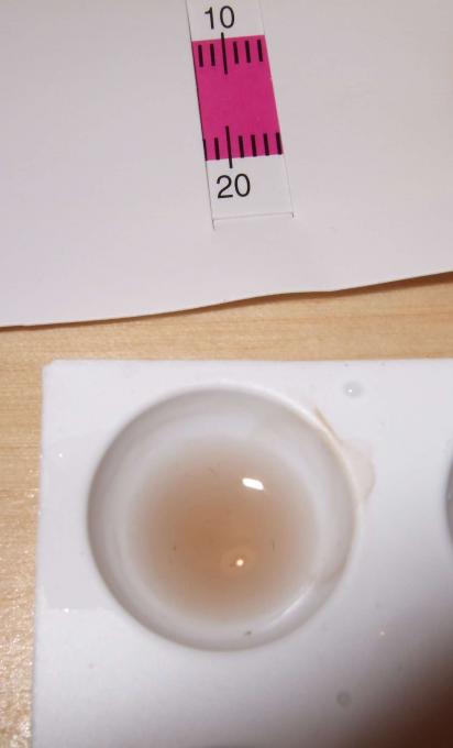 Φοβούμενος ότι κάτι δεν πάει καλά, έβαλα λίγο από το δείγμα αναφοράς (reference sample) που συνοδεύει το κιτ της Saychem και έριξα λίγο από το πρώτο αντιδραστήριο. Μετά από τέσσερα λεπτά, όπως μπορείτε να δείτε στην συνημμένη φωτογραφία, το χρώμα εξακολουθούσε να είναι καφέ, και δεν είχε σχέση με το ροζ-βιολετί της χρωματικής κλίμακας που δίνει η Saychem (συγκρίνετέ το με το ανοιχτό καφέ χρώμα του τραπεζιού που τα έχω ακουμπήσει).