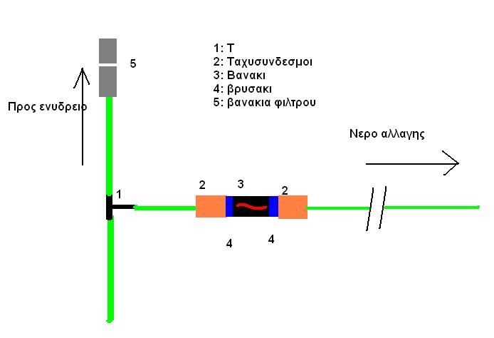 Κοβεις την εξαγωγή του φίλτρου πριν τα βανάκια και βαζεις ενα Τ. Μετα, βαζεις ενα κομμάτι σωλήνα, και ενα βανάκι. Οταν θελεις να βγάλεις νερό, κλείνεις την εξαγωγή και ανοίγεις το βανάκι απο το Τ. Με ενα σωλήνα που έχεις προσαρμόσει, το ρίχνεις στην τουαλέτα/μπαλκονι/νεροχύτη κτλπ. Επίσης για λόγους οικονομίας σου προτείνω να μην τα πάρεις ενυδρείακα (ισως χρειαστεί το Τ να είναι ενυδρειακο) αλλα απο τα είδη κήπου. Δηλαδή θα χρειαστείς: 1 Τ 2 ταχυσυνδεσμους (αυτα τα πλαστικά που έχουμε στα λαστιχα του κήπου για να βάζουμε π.χ. πιστόλι απο μπροστα) 2 βρυσακια (αυτά που βιδώνουμε στις βρυσες κηπου για να μπαινουν οι ταχυσνδεσμοι) 1 βανάκι. Βαζεις το Τ μετα λαστιχο, μετα ταχυσυνδεσμο, βρυσακι, βανακι,βρυσακι, ταχυσυνδεσμο λαστιχο. Ακολουθεί σκιτσο και φωτογραφία! Στην πρωτη πως θα είναι οταν θα βγαζεις νερο Στην 2η φαινονται ξεκαθαρα τα μερη κ πως θα είναι οταν δεν θα βγαζεις νερο. Επισης, αν έχεις καποιο λαστιχο, δεν χρειαζεται να αγοράσεις καινουργιο κ 2ο ταχυσυνδεσμο, μπορεις να χρησιμοποιησεις αυτο.