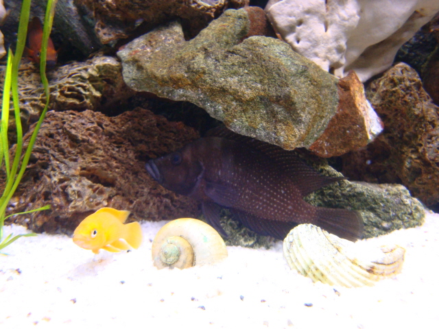 Το ενυδρειο εχει στηθει το 2008 με μικρες αλλαγες μεχρι σημερα, κυριως καποιες πετρες και η διαταξη τους αλλα και στην ψαροσυνθεση η οποια αρχικα ηταν με Α.calvus και Α.compressiceps.Οι πετρες ειναι τοποθετημενες ετσι ωστε να στηριζονται στην πλατη του ενυδρειου αλλα και μεταξυ τους χωρις σιλικονη προσπαθωντας να τις κανω να μοιαζουν με κομματια απο τον βραχο (backround) που εχουν πεσει στον πυθμενα. Διαστάσεις: Ενυδρειο Rena aqualife 350 1,20x0,50x0,70 Όγκος: 350 lt Κατηγορία: Tanganyika Φυτά: 2 βαλισνεριες (οτι εχει μεινει απ΄αυτες) Ψάρια / ¶λλα είδη: N.leleupi 1m+5f+(10 μικρα 1 ετους περιπου τα οποια χαριζονται),2m Α.calvus+(1 μικρο αγνωστου φυλου μεχρι στιγμης), 6 νεριτες και πολλα mts Διακοσμητικά υλικά: λευκη χαλαζιακη αμμος, πετρες διαφορων ειδων ασβεστολιθικες και μη, 2 ξυλα. (χαλίκι, ξύλα κ.λ.π.) Φόντο: βραχος της juvel Φωτισμός: 2x30w μια deep blue της sera και μια απλη λευκη (υπαρχει και 2ο φωτιστικο το οποιο δεν το αναβω παρα μονο σε γιορτες και επετειους Διάρκεια φωτισμού: 4 ωρες Φιλτράρισμα: Rena XP3 1350lt/h και Hagen Fluval 306 1150lt/h Θερμοστάτης: Jager 200 με controller haquoss 500 Λίπανση:- Παροχή CO2:- Παράμετροι: pH: 8,5 Γενική σκληρότητα (GH):- Ανθρακική σκληρότητα (ΚΗ):- Αμμωνία (ΝΗ3):0 Νιτρώδη (ΝΟ2):0 Νιτρικά (ΝΟ3):12,5mg/lt Αλλαγές νερού:20% καθε εβδομαδα Θερμοκρασία:25C ¶λλες πληροφορίες:Σκοπευω να κρατησω τα ενηλικα leleupi και ψαχνω να βρω κι αλλα καλβακια(white chaitika αν εμφανιστουν ποτε ξανα στην Ελλαδα) .Επισης θα μπουν και μερικες ανουμπιες δεμενες στις πετρες. φωτογραφιες σε λιγο
