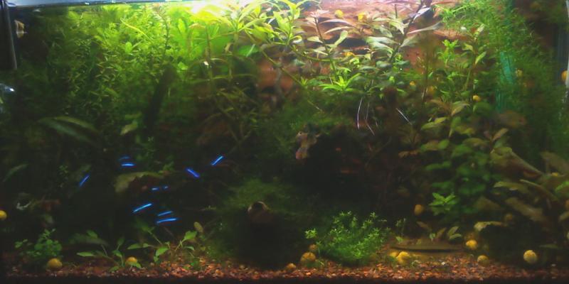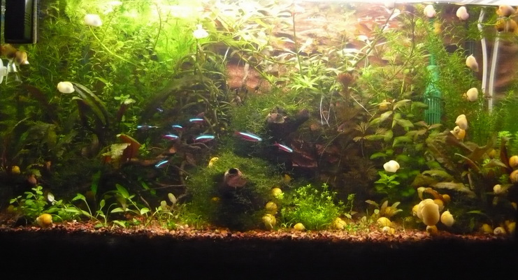Ψάρια: 7-8 mikrogeophagus ramirezi, 10 cardinal tetra, 5 black neon tetra, 1 SAE, 1 ancistrus sp3, 4 corydoras bronze.