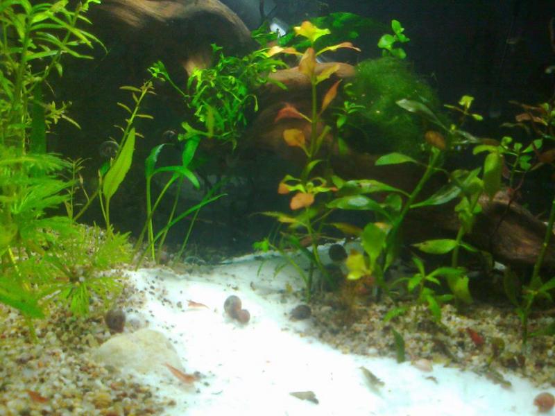 Διαστάσεις:50x30x33 Όγκος:50L (γύρο στα 40 καθαρά) Κατηγορία:Κοινωνικό - Φυτεμένο Φυτά:cryptocoryne, vallisneria , hygrophila , Bacopa caroliniana, java moss, , vallisneria, bacopa monnieri ,ceratophyllum Ψάρια / Άλλα είδη: 4 guppy μωρα , 5 red cherry (θα μπουν και άλλες) , μία γαρίδα ghost ,αρκετα trumpet snails, πολλά ramshorn snails blue Διακοσμητικά υλικά: χαλίκι, ρίζες , άμμος. πέτρες Φόντο: μαύρο χαρτόνι Φωτισμός: 2χ8 watt Διάρκεια φωτισμού: 9 ώρες Φιλτράρισμα: 1 φίλτρο εσωτερικό των 450 λτ/ώρα Θερμοστάτης: 100w Λίπανση:- Παροχή CO2: diy C02 Παράμετροι pH: 7,3 Γενική σκληρότητα (GH): 7 Ανθρακική σκληρότητα (ΚΗ): 6 Αμμωνία (ΝΗ3): 0 Νιτρώδη (ΝΟ2): 0 Νιτρικά (ΝΟ3): 10 Αλλαγές νερού: μία φορά τη βδομάδα 30%