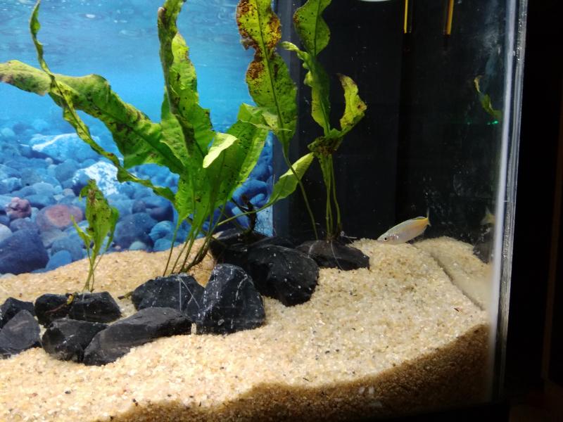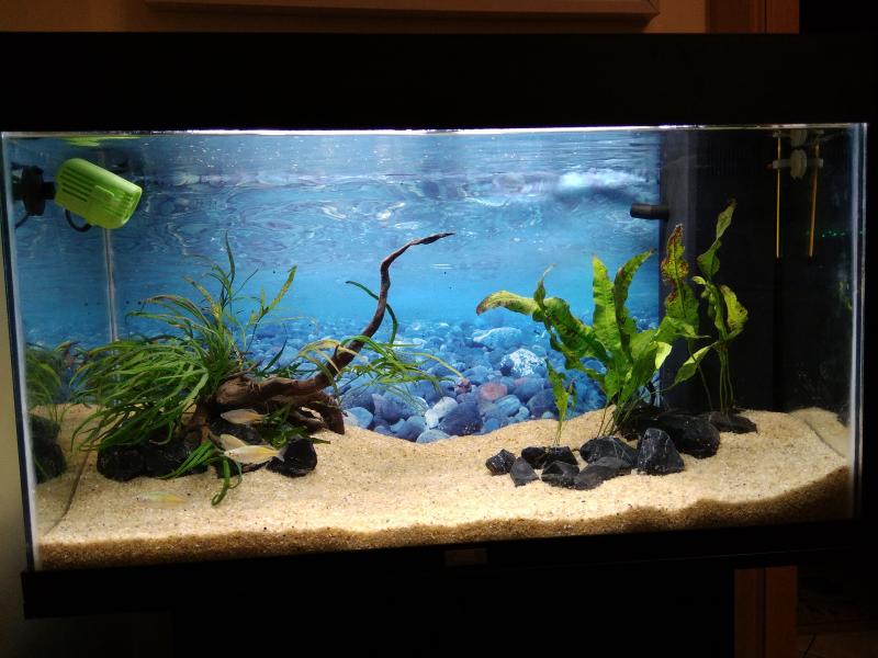 Κατ αρχάς, αφού έστησα ένα diy 35λτ, γλυκάθηκα και με ευκαιρία μια ανακατάταξη του καναπέ στο σαλόνι, είπα γιατί να μην ξαναστήσω και το μεγάλο; Οπότε έφερα το ριο 125λτ απ το πατρικό μου με τη βοήθεια του κουμπάρου μου και ξεκίνησα το διάβασμα… Αρχικά διαπίστωσα ότι ήθελε πολυυυυυύ καθάρισμα γιατί βρισκόταν στην ταράτσα 6 χρόνια εκτεθειμένο στις καιρικές συνθήκες. Εξετάζοντας τα τζάμια του βλέπω στο πλαϊνό μικρό ένα μικρό χτύπημα. Συνεχίζοντας το διάβασμα κατάλαβα πως για να είμαι σίγουρος για τις σιλικόνες του juwel έπρεπε να αφαιρεθούν και να ξανακολληθούν οπότε έτσι και έγινε. Και παραγγέλνω και το μικρό τζαμάκι. Κοιτάζω το μαμά εσωτερικό φίλτρο: σπασμένοι οι κάδοι για τα υλικά. Φτιάχνω νέους από πλαστικό πλέγμα diy. Ο κυκλοφορητής; Εξαφανισμένος, θυμήθηκα μετά ότι είχε καεί . Αναζήτηση νέου και τελικά αγορά hydor 1200lt/h. Εργαστήριο στην ταράτσα: Αφού αφαιρέθηκαν και ξύθηκαν όλες οι επιφάνειες σχολαστικά, ήρθε και η πρώτη ατυχία: Το πρωί βρήκα τα δυο μεγάλα τζάμια σπασμένα στις γωνίες, το πώς έγινε αποτελεί ακόμα μυστήριο. Παραγγελιά λοιπόν άλλα δυο τζάμια στον τζαμά… Κόλλημα, αναμονή 8 ημέρες, γέμισμα, αναμονή 2 μέρες, άδειασμα και μεταφορά στο σπίτι. Και κάπου εδώ κατεβάζω την φαεινή ιδέα να κολλήσω το φίλτρο πίσω αριστερά αντί για πίσω δεξιά που βρίσκεται κανονικά, για αισθητικούς λόγους. Έλα όμως που η αντλία συνδέεται με ένα μικρό πλαστικό της juwel που όταν συνδεθεί αναγκάζει την αντλία να «κοιτάζει» αριστερά! (δηλ προς το τζάμι!) ¶ρα, ξήλωμα του φίλτρου με μακρύ μαχαίρι(η χορδή δεν κάνει δουλειά…) και ξανακόλλημα δεξιά και αναμονή άλλες δυο μέρες. Γέμισμα με άμμο, ξύλα και φυτά και λειτουργία. Το φωτιστικό του μου κάνει κάποια νερά αλλά με εντατικό καθάρισμα στις επαφές του ανάβει. Αγοράζω και μια grolux και για δυο μέρες το χαζεύω και περιμένω απαντήσεις για μπόλι. Ατυχία νο2: Μου καίει την grolux, αγοράζω καινούργια και δεν ανάβει! Κι αρχίζουν να με ζώνουν τα φίδια! Διαβάζω , διαβάζω και καταλαβαίνω ότι μάλλον τα παιξε το φωτιστικό. Φθηνότερη λύση: «εγχείρηση» του μαμα φωτιστικού. Χάρη σε άλλα ποστ στο φόρουμ αλλά και αλλού αντικαταστάθηκε το ballast με νέο της osram (θα ανεβάσω την εγχείρηση στην κατάλληλη κατηγορία) και με μπόλι ξεκίνησε και η έμψυχη λειτουργία του. Επιτέλους μπήκαν και τα πρώτα ψαράκια: 4 μελανοταινίες boesemani |