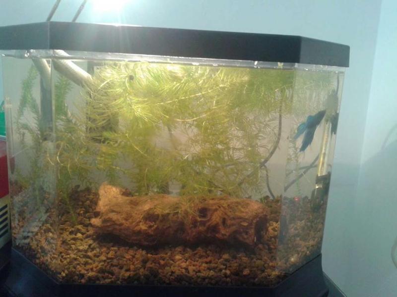 Αυτό είναι το μονομαχοενυδρείο που έχω.. Είναι 27 λίτρα η φίλτρανση είναι 125 l/h θερμοστάτης στους 50w και το έχω μόνιμα στους 26 βαθμούς.. Τα φυτά που έχω είναι κερατόφυλλο και egeria densa και μέσα βρίσκεται ένα ξύλο mopani, κατά καιρούς του πετάω και κανά φύλλο κατάπα.. Εκτός από τον μονομάχο μέσα έχω και μερικά σαλιγκαράκια... Ο φωτισμός που έχω είναι μια απλή λάμπα γραφείου η οποία γράφει πάνω 10w, περίμενα πως τα φυτά μου δε θα τα πήγαιναν καλά γιατί δεν ξέρω κατά πόσο μια λάμπα γραφείου θα τα πάει καλά, αλλά παραδόξως μπορώ να πω πως έχω και καλή ανάπτυξη στα φυτά