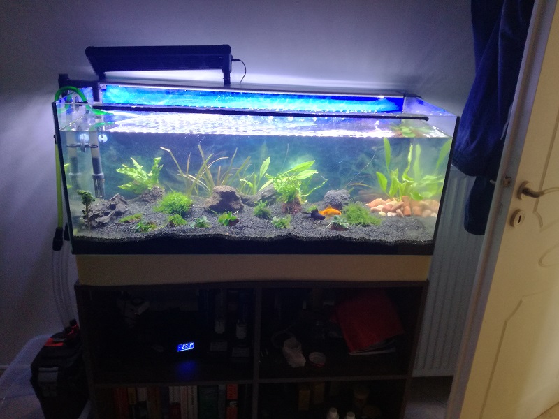 Επιτέλους μπορώ να πω με σχετική σιγουριά ότι το ενυδρείο στρώθηκε. Εδώ και 3 ημέρες μετράω αμμωνία 0 (με 2 διαφορετικά τεστ), NO2 0 και NO3<10 αλλά μη μηδενικά. Χρησιμοποιώ τεστ της sera οπού είναι δύσκολο να διακρίνεις τη χρωματική διαφορά για μικρή ποσότητα NO3. Το συνέκρινα με νερό βρύσης και ήταν σαφής η διαφορά των 2. Το πρόβλημα τελικά ήταν στο φίλτρο και στις σωληνώσεις. Με το που τα καθάρισα η αμμωνία μηδένισε. Προστέθηκε και αεραντλία για καλύτερη οξυγόνωση.