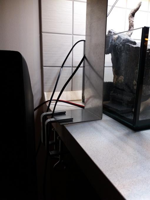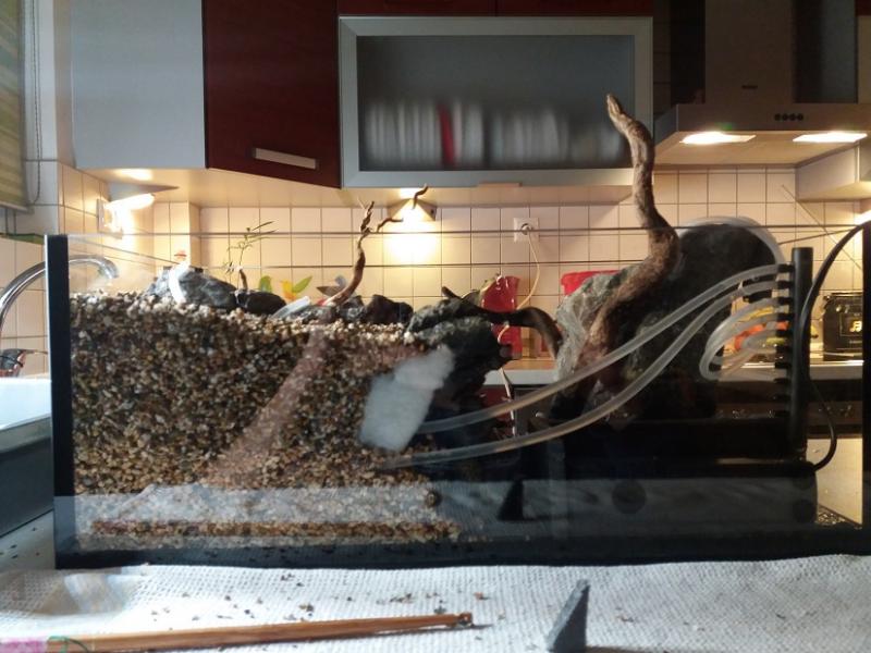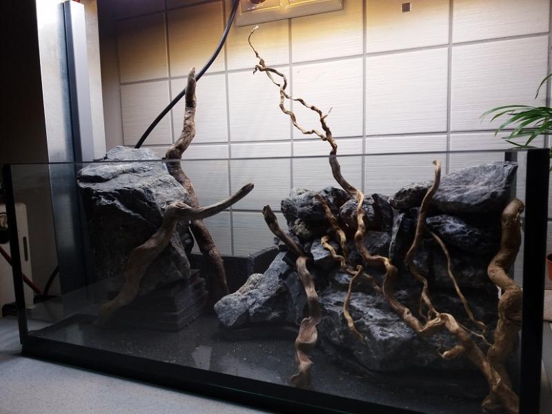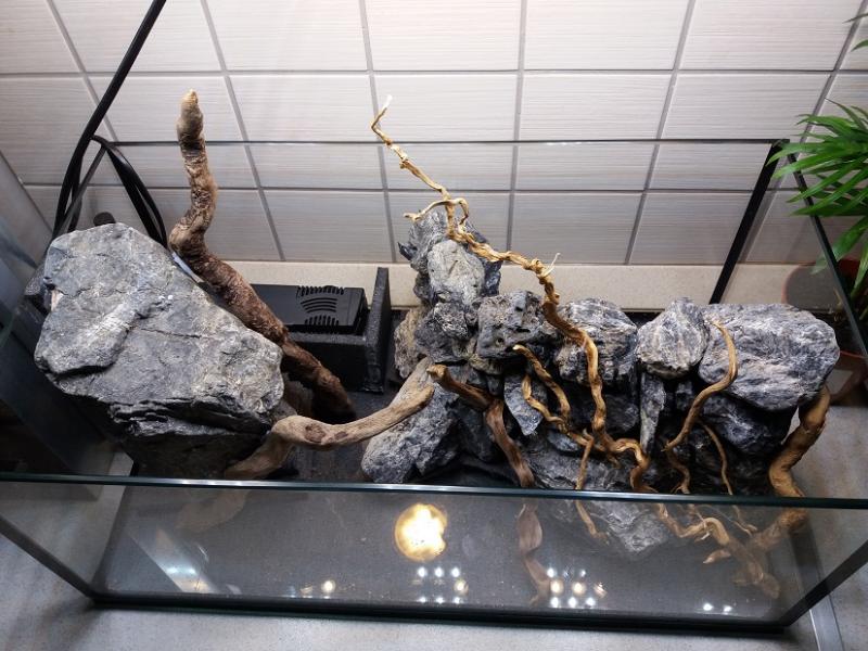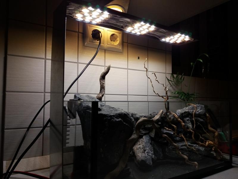 Εδώ και καιρό ήθελα να φτιάξω ένα μίνι paludarium,πιο πολύ για να δώ την κατασκευή,σαν πρόβα για ίσως κάτι μεγαλύτερο στο μέλλον. Η γυάλα κολλήθηκε μιας και και δεν βρήκα πουθενά έτοιμη σε αυτές τις διαστάσεις(45χ25χ18 ).Το νερό θα φτάνει σε ύψος περίπου τα 14-15 εκατοστά,αφήνοντας έξω την κορυφή του βράχου στα αριστερά,και όλη την επιφάνεια της κατασκευής στα δεξιά. 'Ηθελα χώρο για λίγα φυτά μέσα στο νερό,και μία περιοχή εκτός νερού για πολυτρίχι,κάποιες Moss που ευδοκιμούν κοντά στο νερό,και ίσως κάποια emersed υδρόβια. Θέλω το υποβρύχιο μπροστινό μέρος να μην πνιγεί στα φυτά,να φαίνονται οι πέτρες και οι ρίζες,οπότε επέλεξα σαν βασικό φυτό την riccardia(Γιώργο σε ευχαριστώ πάρα πολύ,αν ξανακλαδέψεις θα ήθελα λίγη ακόμη!),με λίγη spicky moss,και anubias petite αν βρώ. Στην αριστερή μεριά έχω βάλει 2 παροχές νερού στην κορυφή του βράχου που φρόντισα με την κλίση που έδωσα ο βράχος να είναι συνέχεια υγρός,και σκέφτομαι κάποια moss από ποτάμι που αντέχει συνέχεια στο νερό,ή monte carlo εάν μπορέσει να αναπτυχθεί πάνω στην πέτρα χωρίς υπόστρωμα. Δεξιά,η επιφάνεια την κατασκευής με το χαλικάκι βγαίνει περίπου 2 εκατοστά πάνω από την επιφάνεια του νερού(ίσως την πάω και λίγο ψηλότερα),και εκεί σκέφτομαι την χαμαιδωρέα,πολυτρίχι,monte carlo,repens, και ότι άλλο σε emersed βρώ. Οι πέτρες έχουν κολληθεί με σιλικόνη για να κατασκευασθεί το "δοχείο" για το υπόστρωμα,και στον πάτο έχει μπεί dow για να πατούν καλά,του οποίου το περίσσευμα κόπηκε και αφαιρέθηκε μετά για να υπάρχει χώρος για περισσότερο υπόστρωμα.Μέσα στο "δοχείο έχουν φυτευθεί παστίλιες λίπανσης της jbl,καθώς και στα υπόλοιπα σημεία που υπολογίζω να φυτεύσω. Το φωτιστικό κατασκευάσθηκε από λαμαρίνα σε στράντζα,με 15 led modules των 1,5 watt,τα 6 είναι 3000Κ και τα 9 είναι 6500Κ,με μία άκρως επαγγελματική λύση για την στήριξή του στον πάγκο!(χαχαχαχα!). Χρησιμοποίησα ένα μικρό εσωτερικό φιλτράκι sun sun για να κυκλοφορεί το νερό με σφουγγάρι και ενυδρειακό βαμβάκι.Βόλεψε πολύ το spray bar, γιατί έχει πολλές υποδοχές πάνω στις οποίες ένωσα εύκολα τα σωληνάκια που τράβηξα πάνω στα βράχια που ήθελα να έχουν συνέχεια νερό. Το φιλτράκι έχει ξαπλώσει μέσα σε ένα "κουτί" από dow που κόλλησα με σιλικόνη πίσω αριστερά,ώστε να είναι σε χώρο καθαρό από χαλίκια,και να μπορεί να βγαίνει εύκολα για καθάρισμα όποτε χρειαστεί. Προς το παρόν,'εβαλα ένα μικρό κρεμαστό φίλτρο με άνθρακα και βαμβάκι να τρέχει για να καθαρίσει το νερό. Το paludarium δεν θα έχει κανένα ζωντανό,μόνο φυτά,χωρίς διοξείδιο. Αυτό που με προβληματίζει,είναι εάν όλα τα υδρόβια φυτά που θέλω(ειδικά η riccardia)θα αντέξουν στο νερό χωρίς θερμαντήρα. Αυτή την στιγμή η θερμοκρασία νερού είναι 16-17 βαθμοί κελσίου. Εάν κάποιοι με εμπειρία στα emersed έχουν κάτι να προτείνουν από επιλογή φυτών,θα το εκτιμήσω πολύ! |