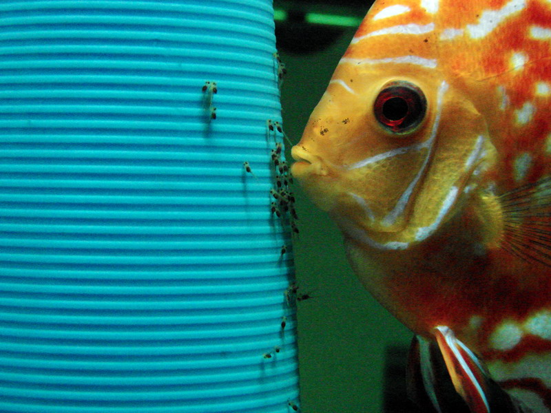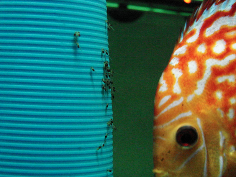ΜΕΡΑ 3ηΚαι εφθασε η μαγικη μερα που ολοι περιμεναμε...... Τα αυγα αρχιζουν να σπανε και μικρες ουριτσες αρχιζουν να φαινονται απο μεσα.... Θα παρατηρησετε μια σχετικη αναταραχη στις σειρες των αυγων απο τα μικρα που προσπαθουν να ξεκολλησουν απο τον κωνο.......Σιγα σιγα τα καταφερνουν και αρχιζουν να πεφτουν στον πυθμενα...... Οι γονεις καθολη τη διαρκεια της αποκολλησης παρακολουθουν αγρυπνα τη διαδικασια και σιγα σιγα αρχιζουν να μαζευουν με το στομα τους τα μικρα που εχουν πεσει κατω και τα φτυνουν σε μερος που αυτα θα θεωρησουν ασφαλη........Ετσι μετα απο καποιες ωρες θα δειτε ενα τσαμπι απο ουριτσες να παλλεται σε καποιο μερος του κωνου ή ακομα και πανω στο τζαμι..... Εχετε υποψη οτι τα μικρα δεν εχουν βγει ακομα απο το αυγο..... Απλα εχουν βγαλει την ουρα τους απο μεσα και για τις επομενες τρεις μερες θα τρεφονται απο το αυγο..... ΜΕΡΕΣ 4η-5ηΤις δυο αυτες μερες τα μικρα αδειαζουν το αυγο τους και σιγα σιγα βγαινουν απο αυτο.....Οι γονεις ειναι σε διαρκη συναγερμο και μαζευουν οσα πεφτουν απο τον κωνο και τα επανατοποθετουν...... Καλο ειναι τις μερες 3-5 να ελαχιστοποιησουμε τις κινησεις και τους θορυβους γυρω απο το ενυδρειο και φυσικα οπως εχουμε πει δεν ταϊζουμε!!!! Θελουμε το νερο να παραμεινει οσο το δυνατο καθαροτερο......Περιττο να σας πω οτι το φως νυκτος ειναι απαραιτητο....... ΜΕΡΑ 6ηΤα μικρα εχουν αρχισει να κολυμπανε και ψαχνουν μανιασμενα τους γονεις για να τραφουν..... Σε αυτη τη φαση πρεπει να προσεξουμε αν καταφερνουν να κολλησουν στους γονεις και να τραφουν ή αν περιφερονται ασκοπα στο ενυδρειο ή ακομα χειροτερα μπερδευουν τους γονεις με καποιο αλλο αντικειμενο που υπαρχει στο ενυδρειο.,.... Οπως σας ειπα και παραπανω τα μικρα ξεχωριζουν τους γονεις απο το χρωμα και για το λογο αυτο οι γονεις πρεπει να ειναι το πιο σκουροχρωμο αντικειμενο στο ενυδρειο...... Τα βαμμενα τζαμια που σας προτεινα παραπανω συντελλουν αποφασιστικα σε αυτο ........Αν ολα πανε καλα τα μικρα θα κολλανε εναλλαξ στους δυο γονεις και θα τρεφονται απο μια βλεννα που παραγουν για το λογο αυτο..... ΜΕΡΑ 7η .......Απο δω και περα αρχιζει ο αγωνας της επιβιωσης!!!! Σημερα ειναι μια καλη μερα να επιχειρησετε την πρωτη αλλαγη νερου..... Με πολυ προσοχη φυσικα και με νερο πολυ κοντα στη θερμοκρασια και τις παραμετρους της γεννηστρας..... Αν ακολουθησατε τις οδηγιες μου με το συστημα της υπεχειλισης και dripping θα δειτε ποσο χρησιμο και ευχρηστο ειναι το συστημα αυτο...... Καλο ειναι να σιφωναρετε και τον πυθμενα αλλα ΠΡΟΣΕΚΤΙΚΑ........Απο σημερα και για καθε μερα θα πρεπει να υπολογιζετε αλλαγες νερου γυρω στο 10%......επισης καλο θα ειναι να απομακρυνετε πλεον και τον κωνο αναπαραγωγης..... Μπορει να ξυπνησει παλι το ενστικτο των γονιων και να θελησουν παλι να αφησουν αυγα..... Δυστυχως ομως πριν το κανουν θα σκοτωσουν τα μικρα..... Απο την 17η μερα και μετα θα πρεπει να εχετε ετοιμη αρτεμια (μωρα) για να ταισετε τα μικρα...... Ενα αλλο θεμα που θα αντιμετωπισετε ειναι το ποτε θα απομακρυνετε τους γονεις...... Οι γονεις πρεπει να απομακρυνθουν οταν