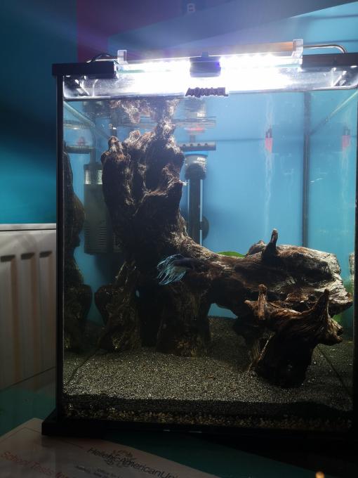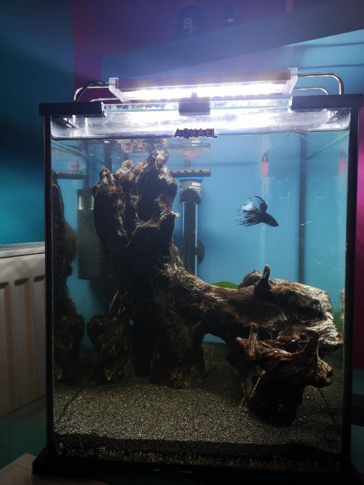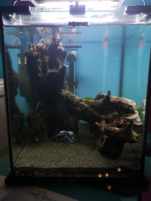 Καλησπέρα σας, σήμερα έγινε η μετακόμιση του μονομάχου απο γκαρσονιέρα σε 4αρι τουλάχιστον θα το χαρακτήριζα μιας και είναι ένας παλιός κύβος που είχα κάποτε θαλασσινό και επειδή καθόταν του έβαλα ένα μικρό φίλτρο με σφουγγάρι και substrat, ένα θερμαντήρα jager, ένα φωτιστικό σώμα SUNSUN ADE-200C LED 12W , υπόστρωμα Hobby Aqualit και απο πάνω λεπτή μαύρη άμμο και ένα ξύλο. Θα ήθελα λοιπόν προτάσεις για κάποια εύκολα φυτά μιας και δεν θα μπει co2 και αν κάποιος έχει κάποια κλαδέματα για να βοηθήσει την κατάσταση (δεν εννοώ απαραίτητα χάρισμα).