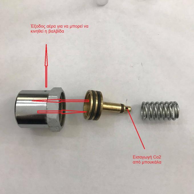 Το άνοιξα και από ότι είδα έχει χαλάσει το ένα από τα δύο Ο-ring που φαίνονται στη φώτο 3 (προφανώς και το άλλο αλλά οπτικός είναι αρκετά καλά) με αποτέλεσμα να μη σπρώχνει την ακίδα όσο πρέπει για να κρατήσει την πίεση σταθερή στο 1.5. Από ότι καταλαβαίνω η κανονική λειτουργία είναι ως εξής: το Co2 μπαίνει από τη μπουκάλα με πίεση μέσα από την τρύπα που φαίνεται στην ακίδα στη φώτο 2, περνάει μέσα από αυτή και βγαίνει στο πίσω μέρος της με αποτέλεσμα να τη σπρώχνει μπροστά. Η τρύπα που φαίνεται στο παξιμάδι είναι για να μπορεί να μετακινηθεί η ακίδα (βγάζει τον αέρα έξω από το παξιμάδι όταν η ακίδα πιέζει προς τα εμπρός). Το ένα O ring έχει χαλάσει με αποτέλεσμα η βαλβίδα να μην σπρώχνει με αρκετή πίεση και να έχω διαρροή (περνάει το CO2 από το παξιμάδι από εκεί που θα έπρεπε να βγαίνει ο αέρας). ¶ρα είναι μια ζημιά 2-3¤. Το θέμα είναι που μπορώ να βρω τέτοια O-Ring.