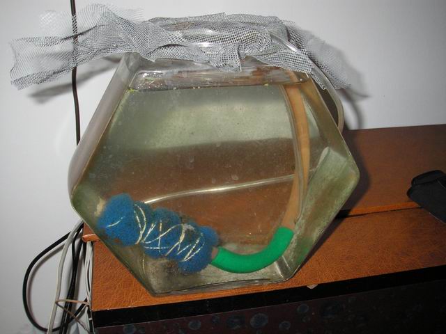 Θα ήθελα να ρωτήσω κάποια πράγματα για κάτι που έφτιαξα, πιστεύω ότι είναι φίλτρο...... . Μόλις έστησα ένα ενυδρείο 54λτ(περίπου 40λτ καθαρά). Πήρα λοιπόν ένα πλαστικό μπουκάλι, του έκοψα τον πάτο και το κόλλησα ανάποδα (με το στόμιο προς τα κάτω) σε σημείο τέτοιο ώστε το πάνω μέρος του να βρίσκεται λίγο κάτω από την επιφάνεια του νερού. Τα υλικά είναι όπως φαίνονται στη φώτο. Από κάτω έβαλα την αεραντλία με αερόπετρα.