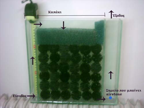 Ετσι οπως το εχεις κανει εχεις πολυ λιγη εως ελαχιστη ροη νερου μεσα απο τα υλικα του φιλτρου. Το μπουκαλι δεν λειτουργει καλα με αεραντλια ως φιλτρο - ή θα προσαρμοσεις μια αντλια νερου στο στομιο, οποτε θαχεις πολυ καλη κυκλοφορια (το συστημα το εφαρμοζουμε στα μικρα ενυδρεια στο συλλογο), ή αν θες να χρησιμοποιησεις την αεραντλια, θελει άλλα υλικα.