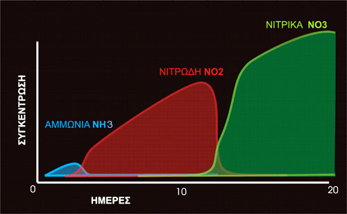 Στην αρχή θα υπάρχει μετρήσιμη μόνο αμμωνία και μετά από μερικές μέρες θα πέσει η συγκέντρωση της και θα εμφανιστούν τα νιτρώδη άλατα τα οποία μέχρι να αναπτυχθούν τα Nitrosomonas θα φτάσουν σε πολύ υψηλές συγκεντρώσεις και θα συνεχίσουν να αυξάνονται μέχρι να εμφανιστούν τα Nitrobacter και να αρχίσουν να μετατρέπουν τα νιτρώδη άλατα σε νιτρικά.