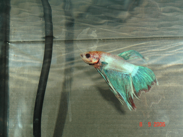 Betta may have clamped fins, lay at bottom or at surface, not eat, lose its color, turn gray, barely swim around. In more advanced cases, its body may start developing red patches, open sores and all kinds of nasty looking stuff. (Even holes in its head!! YIKES!!) Different bacteria affect fish differently. Some will attack the internal organs while others prefer to munch on the skin.