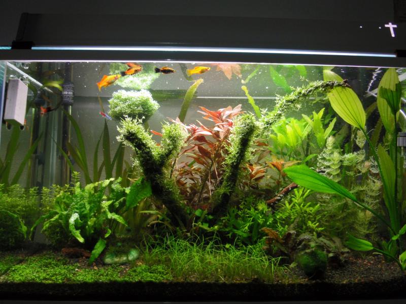 Τυπος ενυδρειου : Φυτεμενο με ξυλα Κοινωνικο Χρονος λειτουργιας:1,5 μηνες Υποστρωμα και ποιο: φυτόχωμα και χαλαζιακο χαλικη 2-3mm Φωτισμος :2 χ AQUA-GLO 25 watt, 2 χ Aqua Medic aqualine T5 Reef White 10K 25 W ,1 χ FLORA-GLO 20 watt Φωτοπεριοδος:8 ωρες Παροχη CO2:μπουκαλα 2L Λιπασματα που χρησιμοποιειτε:easy life profito, traces Αλλαγες νερου :1 φορα την εβδομαδα 30% Θερμοκρασια:24-25 Μετρησεις: ΝΗ3/ΝΗ4:0 ΝΟ2:0 ΝΟ3: ΡΟ4: Fe: ΡΗ:6,5 KH:4 GH:6 Φιλτρανση:FLUVAL 205 Ιχθυοφορτιση:3 neon tetra,5 ξιφοφορους Ειδη φυτων:anubia nana, hygrophila corymbosa , hygrophila corymbosa siamensis ,Cryptocoryne undulata, Singapore Moss,ludwigia arcuata, rotala rotundifolia, vallisneria americana gigantea ,microsorum pteropus,Microsorum pteropus 'Windelov', Hemianthus callitrichoides,cabomba caroliniana,Riccia fluitans,hydrocotyle leucocephala,Bacopa monnieri,Aponogeton ulvaceus,Myriophyllum-spicatum,Ludwigia repens,christmas moss,Cladophora aegagropila. |