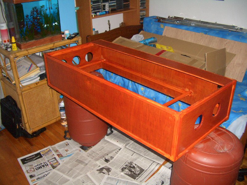 Το καπάκι έγινε και αυτο DIY απο κοντρα πλακε θαλασσης 10mm.Διαστασεις 115Μ Χ 50Π Χ 22Υ.Οι 2 πλαινες μεριες του τρυπηθηκαν καταλληλα με ποτηροτρυπανο 80mm,ωστε να μπουν ανεμηστηρες που θα αναλαβουν την ψυξη.3 ανεμηστηρες φερνουν τον αερα μεσα στο καπακι ,ενω 2 τον απωθουν εξω απο την απεναντι πλευρα.Πρωτα κολληθηκε το τελλαρο του καπακιου και επειτα τοποθετηθηκε εσωτερικο πηχακι 2Χ1 cm ,ωστε το καπακι να μπει φορετο(στυλ κ. γαυρου )Το πανω μερος χωριστικε σε 2 μερη.Ενα σταθερο πλατους 10cm,και ενα ανοιγομενο πλατους 40 cm).Στο καπακι τοποθετηθηκαν 5 λαμπες Τ8 ,ενω τα Balast τοποθετηθηκαν εκτος του καπακιου χαμηλα στην βαση του ενυδρειου για ασφαλεια!Το καπακι περαστηκε και αυτο 3 χερια βερνικι νερου απο μεσα,και 2 απο εξω.