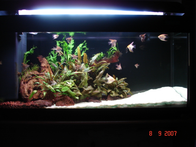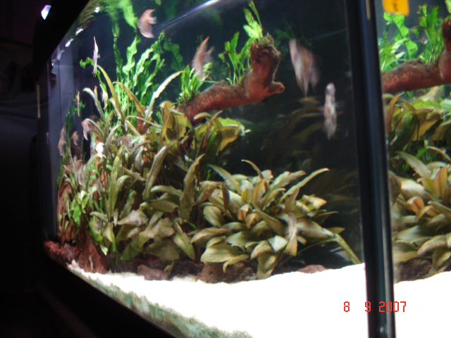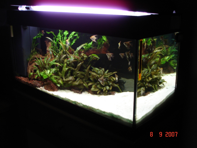 -------------------------------------------------------------------------------- Πληροφορίες Διαστάσεις:80 Χ 30 Χ 40 carrefour Όγκος:ονομαστικός όγκος 96 λίτρα Κατηγορία:παιδική χαρά Φυτά: microsorum pteropus,ceratophyllum demersum, cryptocoryne balansae, cryptocoryne wendtii brown, microsorium "ex Natura". Ψάρια / ¶λλα είδη: Pterophyllum scalare (περίπου 25 μικρά) 1 Corydoras aeneus albino Διακοσμητικά υλικά: ξύλα mopani, ελάχιστες πέτρες, σκούρο χαλίκι κατάλληλο για ενυδρειακή χρήση με ύψος περίπου 5-6 cm,άμμος λευκή ψιλή, υπόστρωμα sera floredepot κάτω από το χαλίκι Φόντο: μαύρο χαρτόνι Φωτισμός: 2 Χ 18W (arcadia original tropica, sylvania daylight) Διάρκεια φωτισμού: 10 ώρες, μέσω χρονοδιακόπτη Φιλτράρισμα: Το εργοστασιακό φίλτρο με αλλαγμένο κυκλοφορητή παροχής περίπου 450l/h. Θερμοστάτης: hydor 100w Λίπανση: - Παροχή CO2:- Παράμετροι: pH:8 Γενική σκληρότητα (GH):33 Ανθρακική σκληρότητα (ΚΗ):10 Αμμωνία (ΝΗ3):0 Νιτρώδη (ΝΟ2):0 Νιτρικά (ΝΟ3):20 Αλλαγές νερού:περίπου 40 λίτρα κάθε εβδομάδα Θερμοκρασία:27-28 ¶λλες πληροφορίες: το ενυδρείο αποκτήθηκε αποκλειστικά για τα μικρά αγγελόψαρα . Αργότερα μπορεί να φιλοξενήσει κάποιο ζευγάρι.Τρέχει περίπου από το Μάιο και στρώθηκε χρησιμοποιώντας υλικά από το 30λιτρο που τα φιλοξενούσε πρίν και από το κύριο ενυδρείο. Φωτογραφία: