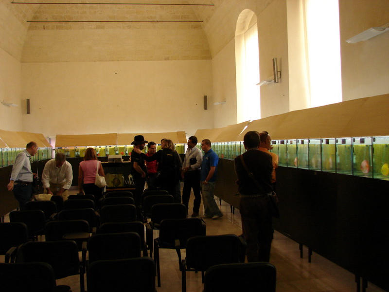 επειδη σας το υποσχεθηκα αν και δεν βλεπω ενδιαφερον...... μια συντομη εκδρομικη περιγραφη απο το υπεροχο Λετσε...... Τελικα μετα απο πολλες διαβουλευσεις και οργανωση κατεληξα να παω μονος στο Λετσε..... Ο καταπληκτικος Φραντσεσκο μου εκλεισε δωματιο και προθυμοποιηθηκε να με παραλαβει απο το αεροδρομιο........ Ετοιμασα βαλιτσα και φωτογραφικες μηχανες και γεματος ανυπομονησια ξεκινησα το μακρινο (ελεω Αλιταλια) ταξιδι για το Λετσε...... Θεσσαλονικη Ρωμη 2 ωρες καθυστερηση , και Ρωμη Πριντεζι αλλες τρεις ωρες καθυστερηση (που μου εκατσαν λουκουμι αφου αλλιως θα εχανα την πτηση )........ Και μετα απο οκτω ωρες εφτασα στο πολυποθητο Μπριντεζι....... Εκει με περιμενε χαμογελαστος ο υπεροχος Φραντσεσκο αν και λιγο σκεπτικος αφου για να ερθει να με παρει εχασε τη διαλεξη του Μπλεχερ...... Μετα απο μια συντομη διαδρομη φτασαμε στον χωρο της εκθεσης...... Ενα μπαροκ αρχοντικο στην καρδια της παλιας πολης...... Η εκθεση ενυδρειακων προιοντων ηταν στην εσωτερικη αυλη του κτιριου (σχετικα μικρη και με λιγα ενυδρεια αξια λογου) εκεινο ομως που πραγματικα με εντυπωσιασε ηταν το κομματι του διαγωνισμου δισκων...... 105 ενυδρεια με ψαρια το ενα καλυτερο απο το αλλο σε μια υπεροχη αιθουσα του κτιριου.......Πραγματικα να σου κοπει η λαλια απο την ομορφια...... Αν και κουρασμενος απο το ταξιδι ο υπεροχος Φραντσεσκος με προσκαλεσε στο γευμα που ειχε οργανωσει ο συλλογος του σε ενα εστιατοριο της περιοχης...... Μαζι μου στο αυτοκινητο θα ερχοταν και ο θρυλος των αγριων δισκων Heiko Bleher.....Να σας πω την αληθεια ψιλομασησα μην πω καμια κοτσανα και παραλληλα μην τον πρηξω τον ανθρωπο με τον Αμαζωνιο ερωτησεων που ειχα στο μυαλο μου να του κανω.....Ολα αυτα μεχρι να τον γνωρισω...... Με το καουμποικο καπελο του και την χαρακτηριστικη απλοτητα ενος ανθρωπου που εκανε το παθος του επαγγελμα με κερδισε απο την πρωτη στιγμη.......Αποτελεσμα ενα τετραωρο συμποσιο με μπολικο κρασι και τον Χεικο ελαφρα μεθυσμενο μετα απο πολλα χρονια οπως μου εξομολογηθηκε....... Το φαγητο απλα υπεροχο, το κρασι μεστο και δυνατο και η συζητηση να ακροβατει αναμεσα στον Αμαζωνιο, τη Χαλκιδικη και τα αφινις φασιατους με τα οποια ειναι ξετρελαμμενος...... Να ειναι καλα ο συλλογος μας και το υπεροχο αφιερωμα που ειχα σε ενα απο τα τευχη του περιοδικου μας και καταφερα να τον εντυπωσιασω και εγω καπου.........Η βραδια κατεληξε στο ξενοδοχειο (που ηταν μια ακομα ευχαριστη εκπληξη, σουιτα με τα ολα της)οπου μοιρασε στον υπεροχο Φραντσεσκο και τον Χεικο περιοδικο και μπλουζακια του συλλογου μας........Κοιμηθηκα σαν πουλακι (η μαλλον σαν δισκακι εμπειρου εκτροφεα) και το επομενο πρωινο μετα απο ενα καλο πρωινο βουρ στην εκθεση....... 10 λεπτα περπατημα στο υπεροχο παραδοσιακο κεντρο του Λετσε που φυσικα ηταν πεζοδρομος........Δευτερο σεμιναριο του Χεικο πανω στη διατροφη των δισκων .......(χαθηκα στις υπεροχες φωτογραφιες του Αμαζωνιου...και αν και στα Ιταλικα νομιζω οτι τα καταλαβα ολα......)Μολις τελειωσε το διωρο σεμιναρια εφτασε και η ωρα για ψωνια.,..... Ενα σταντ γεματο με βιβλια για δισκους και ενυδρεια.......ΠΑραλιγο να το σηκωσω ολοκληρο........Κρατηθηκα ομως.....Μια πιτσα στα γρηγορα ενα εσπρεσσακι και παλι πισω για το δευτερο σεμιναριο της ημερας,..... Ο Γκεμπελς (οχι ο χιτλερικος) ενας απο τους παλαιοτερους γερμανους εκτροφεις δισκων και συγγραφεας αρκετων βιβλιων θα μας παρουσιαζε μια μεθοδο για διατηρηση του πεχα σε επιπεδα δισκων χωρις ιδιαιτερο κοπ
