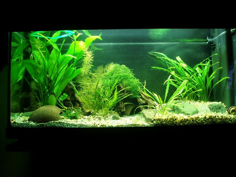 Όγκος: 96L Κατηγορία: κοινωνικό Φυτά: βαλισνεριες, κρυπτοκορύνες, εχινόδορος, τζάβα (για τα υπόλοιπα επιφυλάσσομαι) Ψάρια / ¶λλα είδη: 7x Puntius titteya, 1x (σαλιγκάρι (δεν ξέρω τι)) Διακοσμητικά υλικά: ξύλα, πέτρες Φόντο: μαύρο χαρτόνι Φωτισμός: 1 xosramdaylight 18W+ 1xsylvaniadaylight 18W Διάρκεια φωτισμού: 12 ώρες / ημέρα Φιλτράρισμα: εσωτερικό φίλτρο με αντλία hydor 270 l/h, ενυδρειακό υαλοβάμβακα, μπλε σφουγγάρι και κεραμικό μακαρόνι Θερμοστάτης:hydor 100W Λίπανση:sachemflourish Παροχή CO2:sachemflourish exel Παράμετροι: pH: 8.0 Γενική σκληρότητα (GH):- Ανθρακική σκληρότητα (ΚΗ): - Αμμωνία (ΝΗ3): 0 Νιτρώδη (ΝΟ2): - Νιτρικά (ΝΟ3): - Αλλαγές νερού: 20L κάθε 7 ημέρες Θερμοκρασία: 26 oC ¶λλες πληροφορίες: Όταν είχα πρωτογραφτεί στο forum (23-05-07) είχα ξαναγεμίσει το παλιό ενυδρείο μου γεμάτος χαρά. Δυστυχώς μετά από δύο εβδομάδες, και ενώ ήταν στο στρώσιμο (με αμμωνία μετά από προτροπή μελών του forum) το καταραμένο!!! αποφάσισε πως δεν ήθελε να υπάρχει πλέον και έκανε μια τεράστια ρωγμή στην πίσω πλευρά. Την επόμενη μέρα ήμουν μερικά ευρά ελαφρύτερος και με το ενυδρείο του Carefur στην κατοχή μου. Η δουλειά μου είναι τέτοια που όλο το καλοκαίρι ήταν αδύνατον να ασχοληθώ περισσότερο με το ενυδρείο και δούλευε μόνο με τα φυτά και μερικές χιλιάδες σαλιγκάρια!!! !!!! (κάθε δύο ημέρες έριχνα τροφή και κάθε δύο εβδομάδες άλλαζα τη μισή ποσότητα νερού).Τα ψάρια προστέθηκαν τις τελευταίες τρεις εβδομάδες. Και μία ερώτηση για το κλείσιμο : Πόση τύρφη πρέπει να βάλω για να κατεβάσω λίγο το pH, εκεί γύρω στο 7–7,5 ; Συγνώμη για το μακροσκελές του post, photo από Δευτέρα.