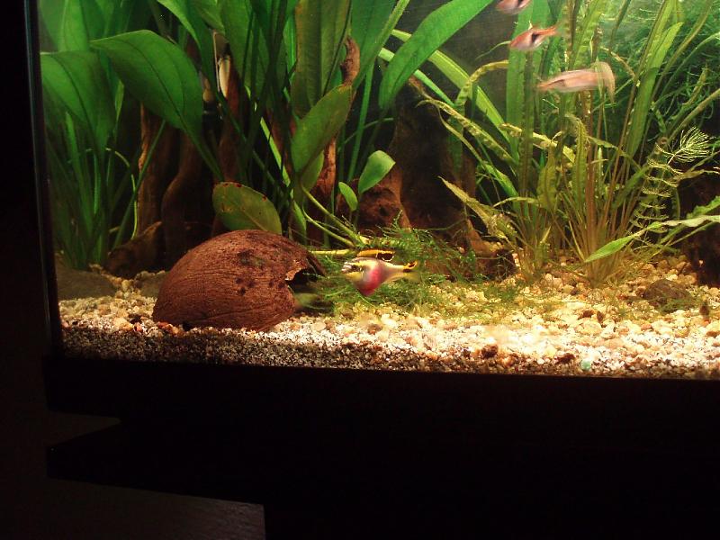 Πριν τρεις μέρες διάλεξαν μία από τις δύο καρύδες και το αρσενικό άρχισε να κλείνει την είσοδο ώστε στο τέλος ίσα που χωρούσαν να περάσουν μέσα. Χθες μπαινόβγαιναν στην καρύδα μια το ένα και μια το άλλο και μερικές φορές μαζί. Δυστυχώς δεν έχω photo από τα χθεσινά. Έχω μερικές από τα τσαλίμια τους μερικές μέρες πριν. Στο ενυδρείο έχει αντικατασταθεί η μία λάμπα με μία ροζ για φυτά της Arcadia. Επίσης η σύνθεση των ψαριών είναι πλέον 5 x Puntius titteya 5 x Trigonostigma heteromorpha 2 x Pelvicachromis pulcher