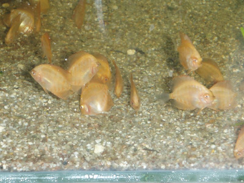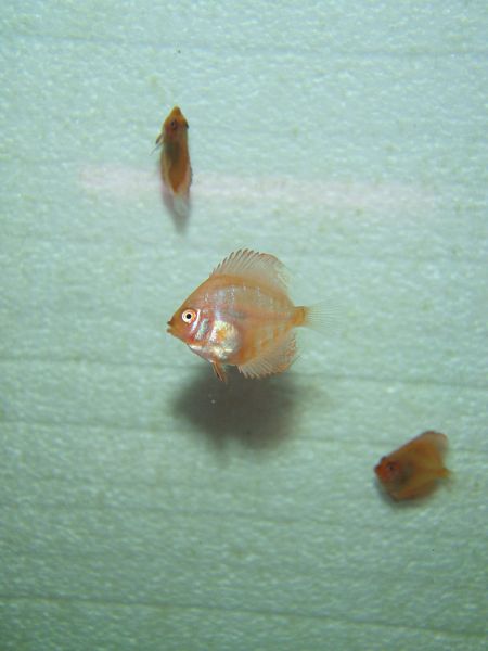 Τα μικρά των pigeon βρέθηκαν σε στάδιο free swimming στις 24-8 οπότε και περίμενα να κολλήσουν στου γονείς. Όταν την επόμενη το πρωί τα βρήκα όλα στον πάτο του ενυδρείου και πάλι, πήρα την απόφαση και αφού τα ρούφηξα με μία σύριγγα όπου είχα προσαρμόσει λάστιχο για αεραντλία τα έριξα στον κώνο του άλλου ζευγαριού. Το δεύτερο ζευγάρι αμέσως δέχτηκε τα μικρά σαν να ήταν δικά του και αυτά κόλλησαν αμέσως στον μπλε αρσενικό, ο οποίος ανέλαβε εξολοκλήρου την ανατροφή τους (η πορτοκαλί θηλύκια σπάνια προσφέρθηκε στα μικρά). Τα μικρά του δεύτερου ζευγαριού, που δεν ήταν και πολλά (ήταν η πρώτη τους γέννα) κόλλησαν και αυτά 2 μέρες αργότερα.