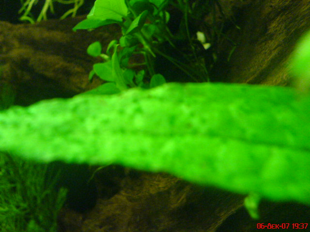 Δυνατός φωτισμός - έλλειψη co2 - περίσσια φωσφορικών. Παρουσιάζεται σε φυτά αργής ανάπτυξης που φωτίζονται πολύ, (ίσως να βοηθήσει η μεταφορά τους σε πιο 'σκιερή θέση') και δεν αφαιρείται εύκολα. Κάντε συχνές αλλαγές νερού, ταϊστε λιγότερο, προσθήκη-αύξηση co2 και βάλτε μερικά φυτά γρήγορης ανάπτυξης. Ακόμα κρατήστε τα φωσφορικά σε χαμηλά επίπεδα.