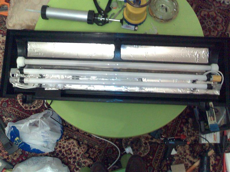 Η μονη ενσταση μου ειναι οτι (αν καταλαβα καλα ) ολο τον ηλ. εξοπλισμο σου -μπαλαστ, λαμπες- τον συγκρατεις σε ενα κοματι πλαστικο το οποιο το εχεις κολλημενο με θερμοκολληση , με κινδυνο να σου πεσει μεσα στο νερο ολο μαζι... Σε δικες μου κολλησεις με θερμοκολληση ειχα προβληματα κατα καιρους με ξεκοληματα.... Βρες κατι να στηριξεις με ασφαλεια το ολο συστημα.