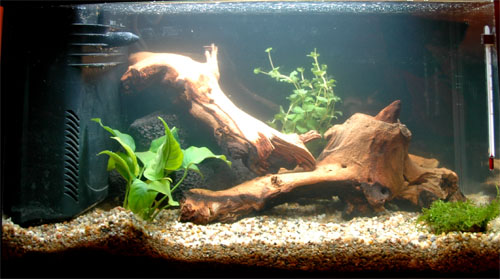 Έχω βάλει μία πέτρα μάυρη (γεμάτη μικρές τρυπούλες) με ένα πέρασμα (τρύπα μεγάλη), 2 ξύλα (mopani) και 3 φυτά (Java moss πάνω σε μία πετρούλα, 1 anubia και 1 bacopa caroliniana)