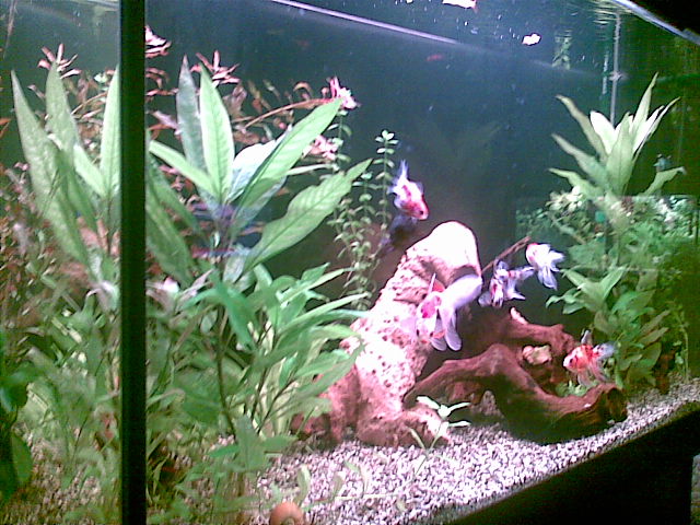 Πληροφορίες Διαστάσεις: 100χ40χ65 Όγκος: 220λιτ καθαρα Κατηγορία: Φυτεμενο με χρυσοψαρα Φυτά: Anubia barteri , Bacopa monnieri , Hygrophila polysperma ,,Hygrophila corymbosa, Microsorum pteropus, Bacopa caroliniana Ψάρια / ¶λλα είδη: 3 oranda , 1 Black moor ,1 red cup,1 pearlscale / 2 apple snails Διακοσμητικά υλικά: 3 ριζες / 2 μοπανι- 1 Savannawood steelblasted (χαλίκι, ξύλα κ.λ.π.) ποταμισιο ψιλο χαλικακι Φόντο Μαυρο χαρτονι Φωτισμός:1χ 25watt Arcadia original tropica, 1x25 watt Arcadia freshwater,1x25 watt phillips aquasky Διάρκεια φωτισμού: 10 ωρες Φιλτράρισμα: 1 χ eheim 2026 ,1 x eheim 2224 Θερμοστάτης: 200watt jagger Λίπανση: flourish, flourish excell , flourish pottasium Παροχή CO2:- Παράμετροι: pH: 7.5 Γενική σκληρότητα (GH): 12 Ανθρακική σκληρότητα (ΚΗ): 9 Αμμωνία (ΝΗ3): 0 Νιτρώδη (ΝΟ2): 0 Νιτρικά (ΝΟ3): 10-15 Αλλαγές νερού: 30% καθε 10 ημερες Θερμοκρασία: 23οC ¶λλες πληροφορίες: Οταν σβηνουν τα φωτα την οξυγονωση την αναλαμβανει μια αεραντλια eheim Φωτογραφία:οι φωτος ειναι απο κινητο οποτε ..