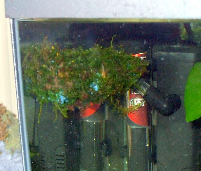 Είχα ένα ορθογώνιο κομμάτι σφουγγάρι και του έφτιαξα μια τρύπα για να μπει μέσα το σωληνάκι του φίλτρου. Το στρογγύλεψα και το "έντυσα" με ένα βρυόφυτο! Τώρα να πω την αλήθεια δεν μου πολυάρεσε ένα "αδέσποτο" βρυόφυτο, άχαρο είναι, αλλά την δουλειά του την κάνει! Δεν ησυχάζω όμως! Κάτι ακόμα τριγυρίζει στο μυαλό μου.... Θα δούμε .....