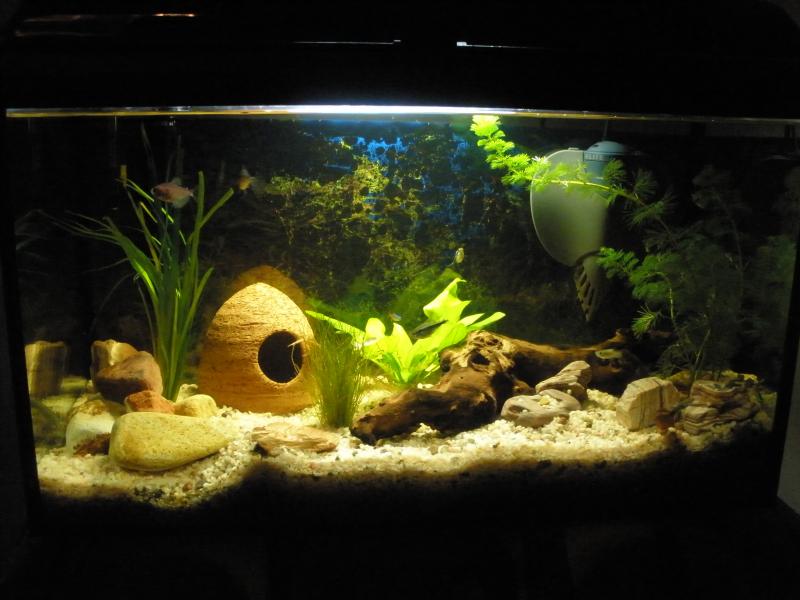 Το ενυδρείο σου είναι πολύ όμορφο και σίγουρα δεν έχει καμία σχέση με αυτό που δείχνεις στο προφίλ σου. Πολύ πολύ καλύτερο. Να ξέρεις πάντως πως ένα ενυδρείο ποτέ δεν είναι εντελώς έτοιμο. Και γω κανένα χρόνο το παλεύω αλλά ακόμα... Θα μπορούσα να κάνω καμιά προτασούλα; Λοιπόν, κατ' αρχήν πρόσθεσε λίγο ακόμα νερό, ώστε η επιφάνεια του νερού να καλύπτεται από το πλαίσιο του ενυδρείου και να μην φαίνεται. Θα δείξει πολύ πιο ωραίο! Τις μεγαλύτερες πέτρες και το ξύλο, εγώ θα τα πιέζα λίγο προς τα κάτω ώστε να χωθούν λίγο μέσα στο χαλικάκι και να φαίνεται σα να βγαίνουν μέσα από αυτό. Επίσης πολύ μου άρεσαν οι πέτρες που έχεις στην δεξιά γωνία του ενυδρείου σου. Αν μπορείς να βρεις και άλλες ίδιες βάλε μόνο τέτοιες. Και δύο ερωτήσεις. Πόσα λίτρα είναι το ενυδρείο σου; Τι ψαράκια έχεις ή τι συνδιασμό ψαριών σκέφτεσαι να βάλεις; Αυτά...