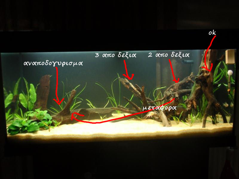 ![]() Δεξια ειναι καλυτερα τα πραγματα με το ορθιο ξυλο. (ισως πιο κολλητο στο φιλτρο να ειναι πιο καλα) Δοκιμασε να κανεις ενα συμπλεγμα με το 2ο απο δεξια ξυλο (που δεν προσφερει και πολλα εκει που ειναι) σε συνδιασμο με το μεγαλο αριστερα ετσι ωστε να "σηκωθει" απο την αμμο και να δημιουργηθει μια γεφυρα να περνανε τα ψαρια και απο κατω. Το 3ο απο δεξια ξυλο που εχει τα κοψιματα στον αερα, γυρνα τα και "φυτεψε" τα ελαφρως στην αμμο αφου το φερεις πιο δεξια να κρυψει κι αυτο το φιλτρο μαζι με το μεγαλο ξυλο. Εχε γενικα στη σκεψη σου κατα τη διακοσμηση, καποια λεπτα κλαδια να τα "φυτευεις" στο βυθο, σαν να ξεφυτρωνουν απο εκει τα ξυλα. χεχε