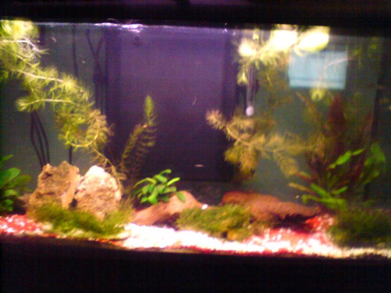 Όγκος:96 Κατηγορία: Φυτά:ανουμπια νανα , ανουμπια gogensis κερατοφυλλο java moss αι κρυπτοκορινα wentil mi oya Ψάρια / ¶λλα είδη: 4 guppy 1 m 3 fm και 2 black neon και 4 apple snails και μερικα μικρα γκαπι Διακοσμητικά υλικά: ασπρο-κοκκινο χαλικι πετρες ριζες (χαλίκι, ξύλα κ.λ.π.) Φόντο:τπτ τωρα .αργοτερα καθρεφτης Φωτισμός: 18 βαττ Διάρκεια φωτισμού: απο το πρωι μεχρι το βραδυ Φιλτράρισμα:μαμισιο με αλλαγμενα υλικα Θερμοστάτης:150 βαττ Λίπανση: excell Παροχή CO2:-- Παράμετροι: pH: περιπου 7 Γενική σκληρότητα (GH):δεν μετραω Ανθρακική σκληρότητα (ΚΗ):δεν μετραω Αμμωνία (ΝΗ3):δεν μετραω Νιτρώδη (ΝΟ2)δεν μετραω Νιτρικά (ΝΟ3):δεν μετραω Αλλαγές νερού:30% 20 μερες Θερμοκρασία:25 ¶λλες πληροφορίες: Φωτογραφία: την μοσσ την εβαλα καλα...πανω στις πετρες ειναι δεμενη.. |