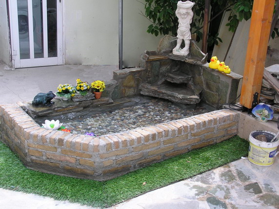 Έφτιαξα στην αυλή μου μια λιμνούλα διακοσμιτική για να ομορφαίνει ο χώρος όπου περνάμε αρκετές ώρες το απόγευμα,με καφεδάκι και χαλάρωση.Μου προέκυψε χτίζοντάς το σιγά-σιγά κάτι σαν συντριβάνι όπου το νερό ανεβαίνει σε ένα αγαλματάκι και απο εκεί σε δύο λεκάνες για να καταλήξει στην λιμνούλα.Έγινε πολύ όμορφο και χαίρεσαι να το βλέπεις και να ακούς τον ήχο του νερού...καταράκτη δεν θα το έλεγα γιατί η αντλία που έχω προς το παρόν είναι μικρή 600 l/h.
